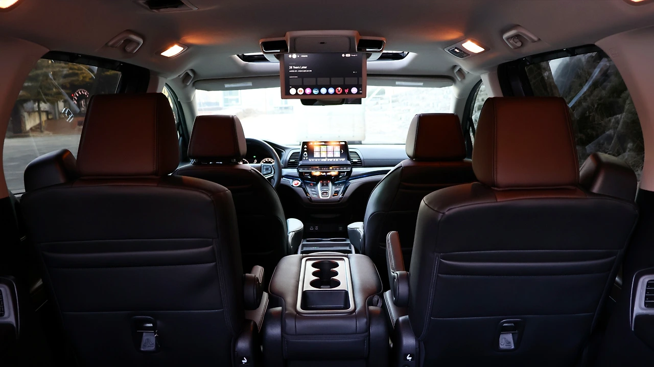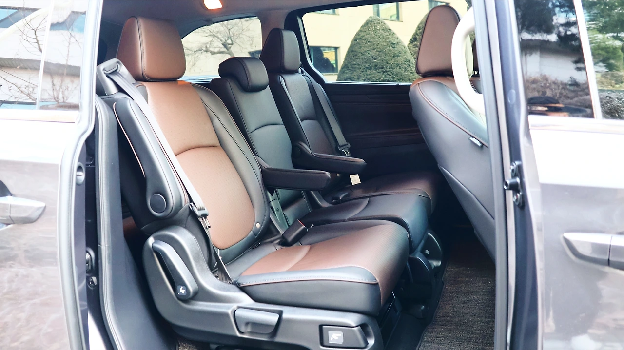 미니밴의 핵심은 역시 후석 공간이다. 파워 슬라이딩 도어와 테일게이트는 물론 기본이다. 높은 전고를 바탕으로 광활한 실내 공간을 구현하고 있으며, 바닥 면도 센터터널 없이 평탄하게 마감하여 안락한 공간감을 제공했다. 2열 시트도 투톤 펀칭 가죽 시트가 구성되고, 독립적인 시트 리클라이닝과 슬라이딩이 가능하다. 센터 시트 탈거가 가능한 만큼 독립적인 암 레스트도 부착된다. 오딧세이의 가장 큰 특징은 2열 매직 슬라이드 시트, 센터 시트를 탈거한 후 독립 시트를 종 방향으로 조절할 수 있어 1열과 2열 좌석의 배치를 자유롭게 설정할 수 있다.