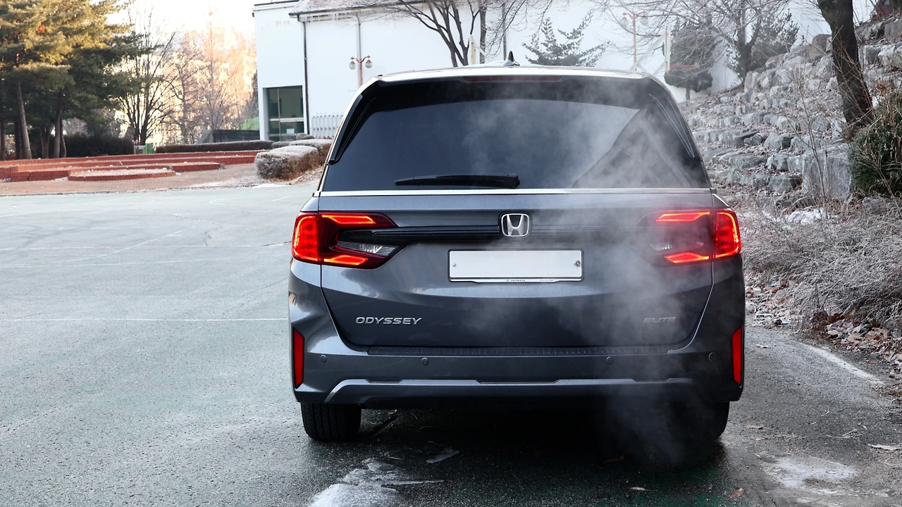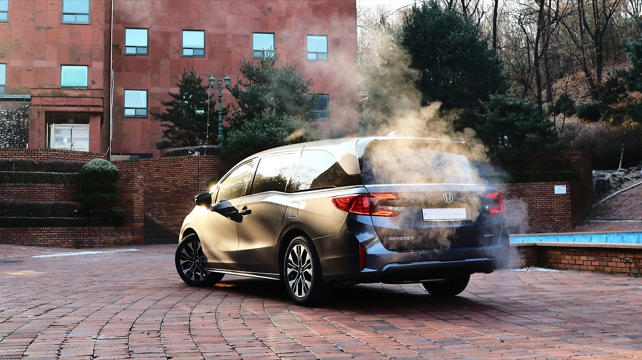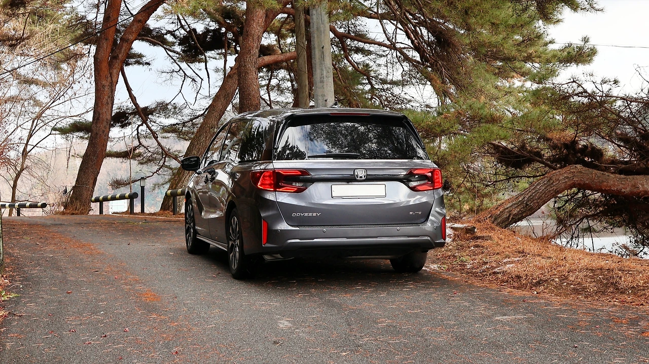 혼다 오딧세이는 차체 크기에 비해 휠베이스가 짧은 편이다. 그 덕분에 리어 오버행 길이가 굉장히 긴 편이고, 독특한 비율 자체가 오딧세이의 특징이 되어주기도 한다. 휠은 19인치 알로이 타입, 사진상 아담해 보이는 사이즈로 차량의 커다란 덩치를 체감할 수 있겠다. 직선 위주의 디자인으로 구성된 리어 엔드는 절제미가 느껴진다. 테일램프는 'ㄷ'자 형태로 정교한 LED 그래픽을 품고 있으며, 스모키 톤 마감이 더해져 무게감 있는 인상을 구현한다. 역시 범퍼는 깔끔한 형태, 수직형 리플렉터가 정제된 모습이다.
