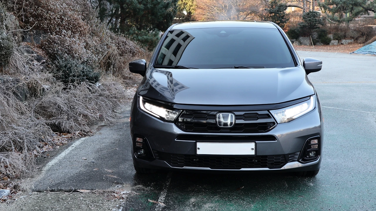 최상위 트림 ELITE 사양을 표준으로, 고급스러운 외관을 보여주는 혼다 오딧세이다. 서론의 내용처럼 오딧세이 차량은 승용차에 가까운 스타일링을 지향한다. 최대한 낮게 깔려있는 프런트 마스크부터 그 성격이 드러난다. 차체 전방을 가로지르는 가니시 바와 날카로운 LED 헤드램프, 그리고 육각형 형태의 라디에이터 그릴은 혼다의 전형적인 패밀리룩이 반영되어 있다. 범퍼 형상은 간결하면서도 와이드 한 이미지, 차량 분위기에 잘 어울린다. 전체적인 차량 액세서리가 전부 검은색으로 마감되어 있어, 차분하면서도 세련된 이미지는 더욱 확실해진다.