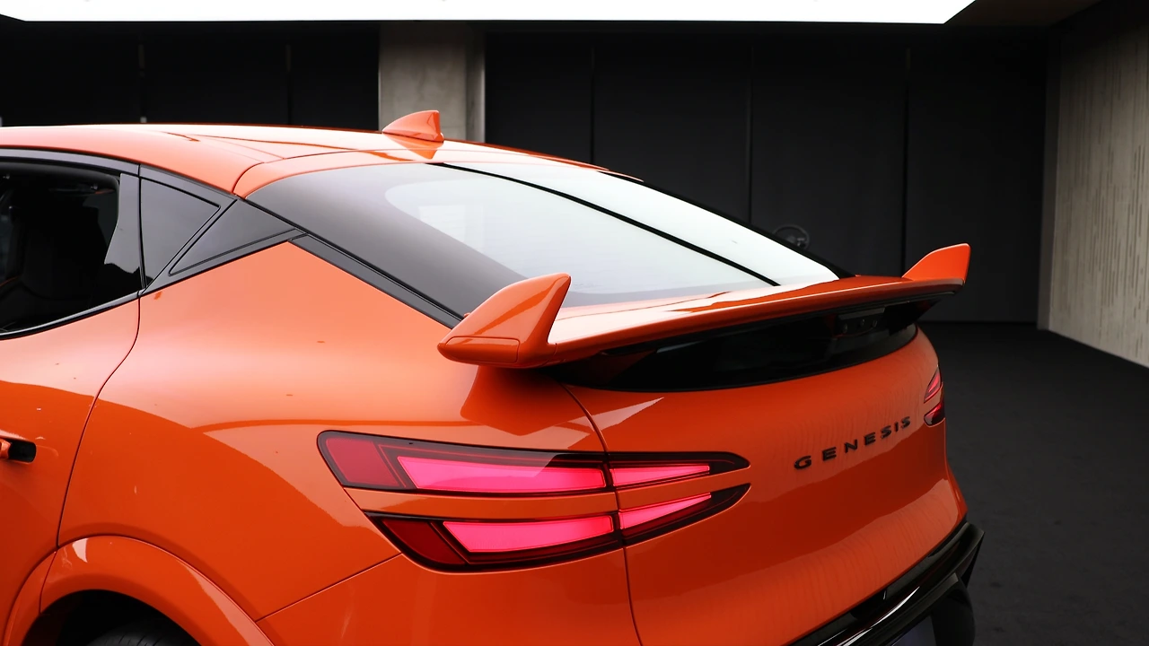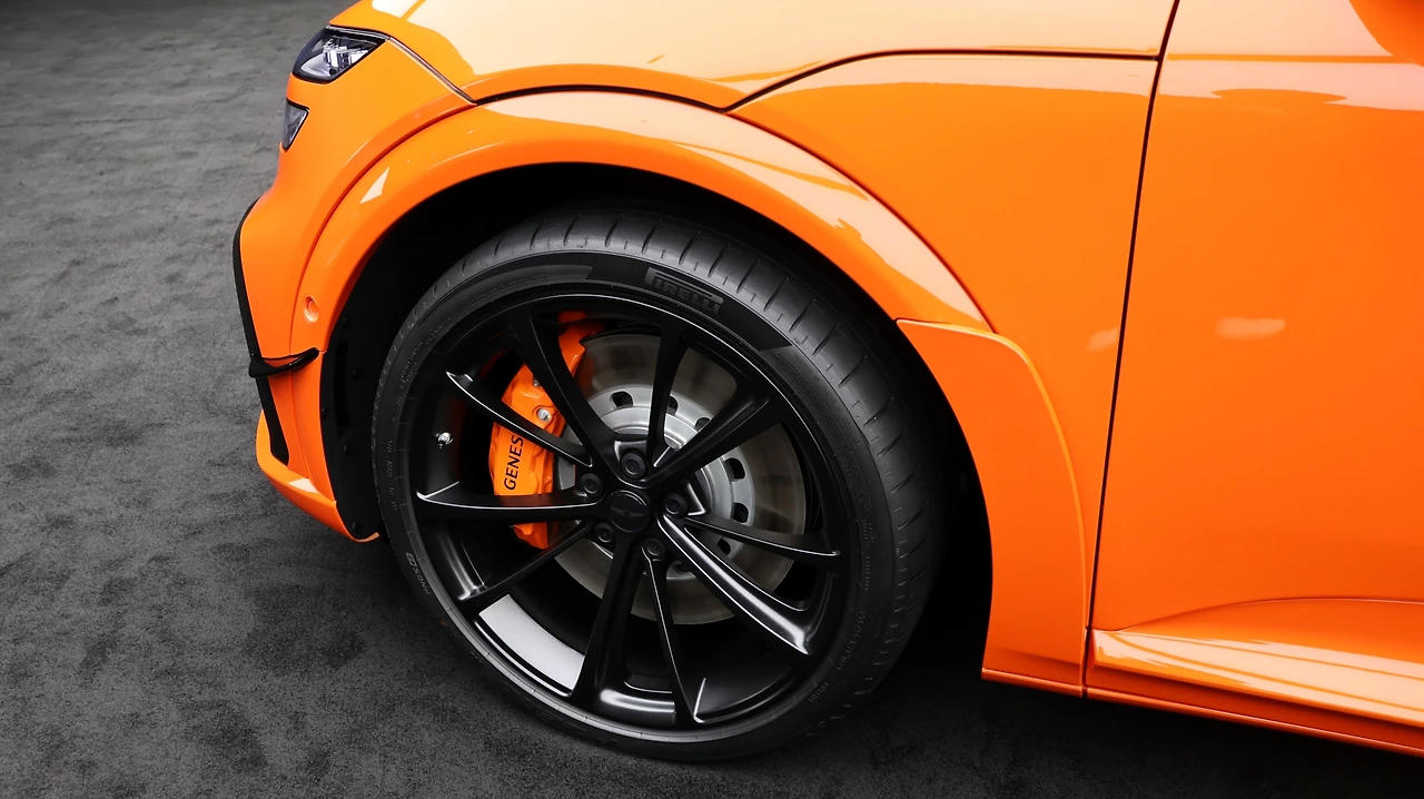 GV60 마그마의 디자인은 기존 모델의 아쉬운 점을 대부분 보완해 냈다. 지상고를 낮추어 크로스오버 특유의 불안정한 스탠스를 지워 내고, 전용 범퍼와 각종 에어로파츠는 전기차 특유의 밋밋한 이미지를 완전히 덜어낸다. 사뭇 기존 GV60도 꽤나 역동적인 실루엣을 갖추고 있었다는 점이 체감 간다. 특히 C필러 라인은 쿠페처럼 우아하고도 가파르게 떨어지며, 상승하는 형태의 벨트라인은 인상적인 대비를 남긴다. 두터운 숄더 라인도 꽤나 매력적인 윤곽선을 구현해 준다. 이토록 역동적인 실루엣과 고성능 드레스업은 이상적인 시너지를 발휘했다.