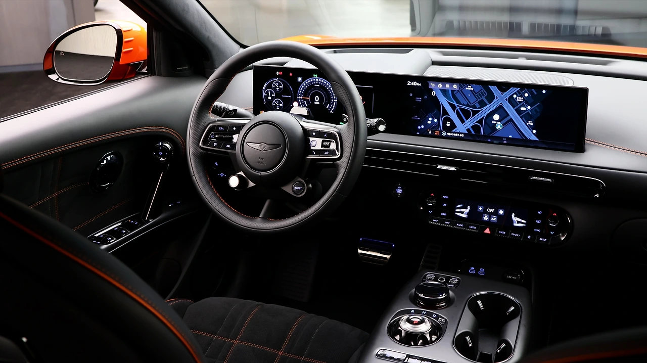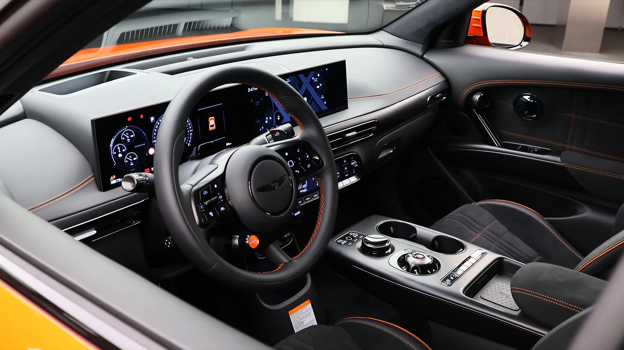 실내 공간이다. 기존 GV60과 같이 27인치 OLED 디스플레이와 HUD로 인터페이스를 구축하고 있다. 3-서클 클러스터와 실시간 주행 데이터 확인이 가능한 마그마 전용 UI를 제공한다. 센터패시아에는 소형 스크린과 함께 공고지가 탑재되었고, 여타 조작 기능은 센터 콘솔에 다이얼식 변속기와 함께 배치된다. 마그마 전용 스티어링 휠과 10방향 전동 버킷 시트는 사용감부터 기존 GV60과 차별화된다. 추가로 실내 곳곳에 스웨이드 계열의 샤무드 소재가 스포츠카 고유의 감성을 제공하며, 곳곳의 오렌지 스티칭 마감은 브랜드의 정교함이 느껴진다.
