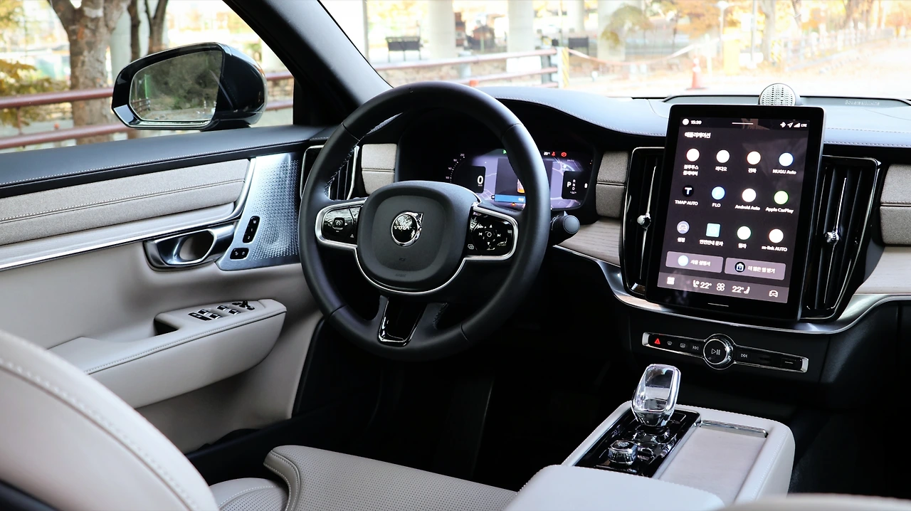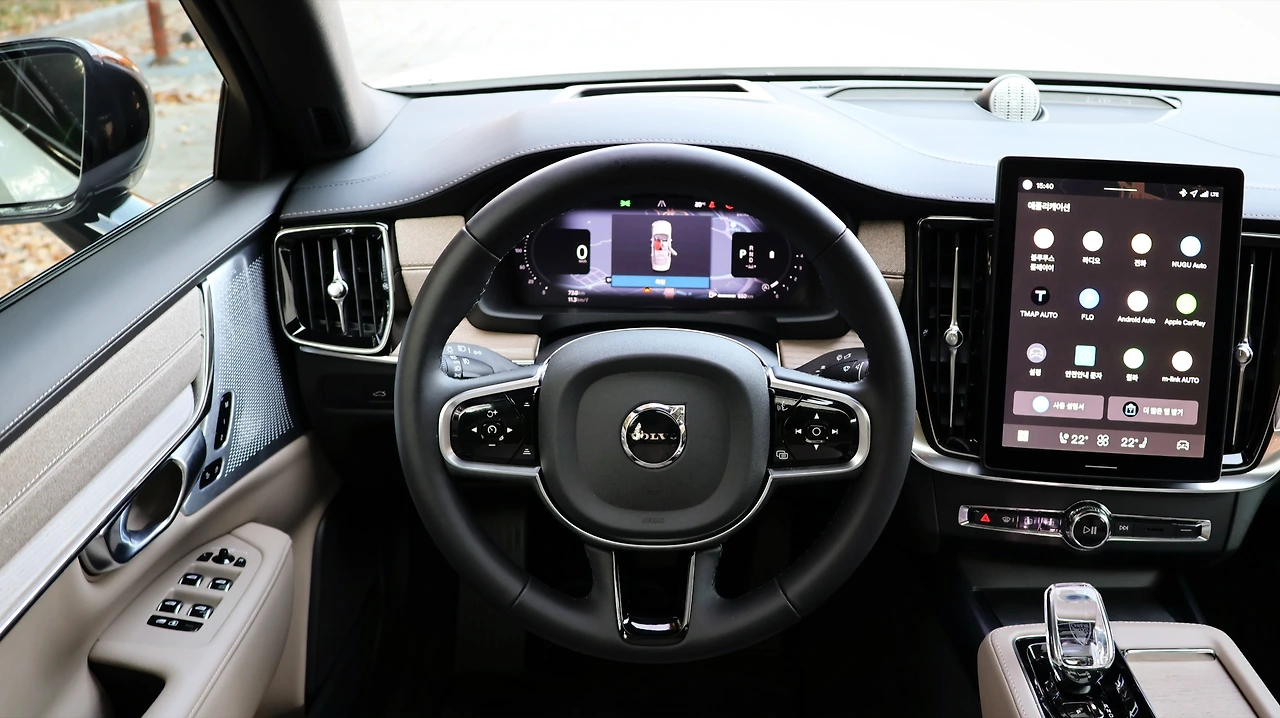 새롭게 디자인된 DRL 그래픽의 웰컴 시그니처 라이팅은 더욱 역동적으로 시선을 이끌어 낸다. 승하차 시에 눈에 들어오는 20인치 휠 디자인의 완성도가 시승 내내 만족감을 높여주는 요소였다. 엔진 시동 버튼은 로터리 타입, 시트에 앉아 팔을 올리면 자연스레 시동 버튼에 손이 올려진다. 볼보의 라이트 사이징 엔진은 특성상 소음이 크게 느껴질 수밖에 없는데, 외부와 내부에서의 소음 차이는 극명하다. 마일드 하이브리드 덕분에 엔진 떨림도 적절하게 억제되어 있어 기본적인 N.V.H 성능은 만족스러운 편이다.