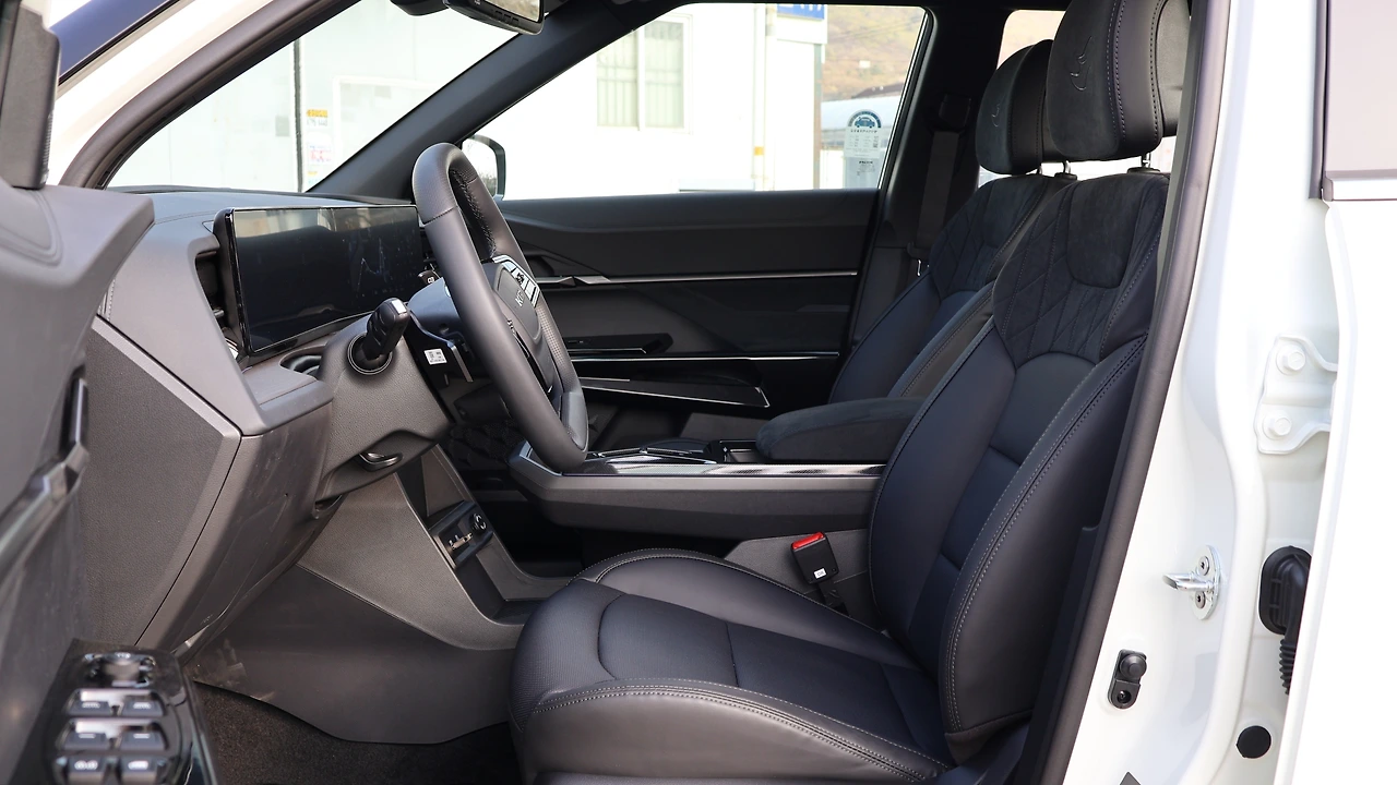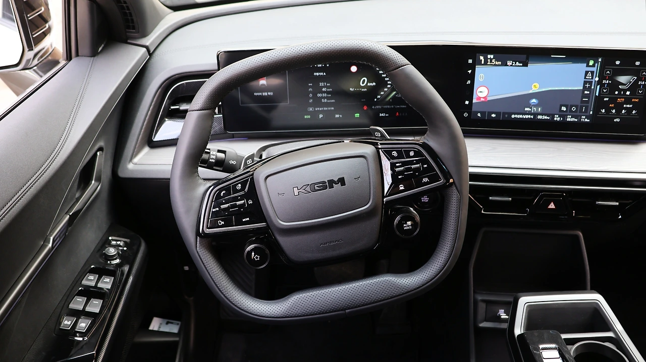 실내 구성은 기존 토레스 EVX와 거의 동일했다. 12.3인치 병렬 디스플레이 적용과 함께, 아테나 2.0 버전 개선형 GUI를 채택한다. 기어 레버는 토글 타입, 2층 구조의 센터 콘솔은 뛰어난 수납 능력을 보여준다. 더블 D컷 형태의 스티어링 휠과 다채로운 실내 마감 소재, 앰비언트 라이트가 고급스러움을 더해주기도 한다. 무엇보다 이번 무쏘EV 블랫 엣지는 전용 엠블럼과 함께, 암 레스트와 헤드레스트 등 스웨이드 소재의 마감이 매력적이다. 특히 헤드레스트 자수로 각인된 무쏘 로고가 마음에 든다. GUI에 한해 무선 OTA 기능까지 지원한다.