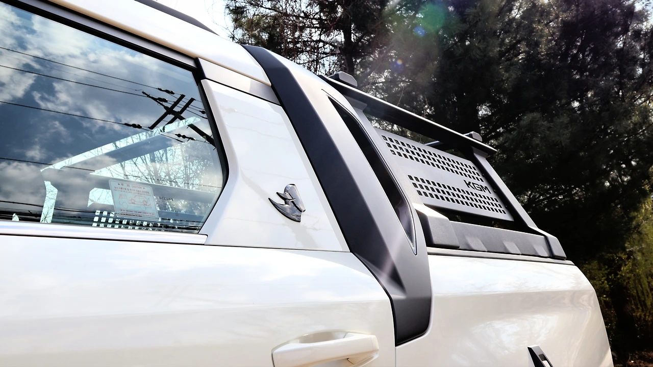 측면 디자인이다. 마찬가지로 전방부는 기존 토레스 라인업과 유사한 형태를 보인다. 대신 휠베이스가 더 길게 연장되면서 웅장함은 더해졌다. 블랙 색상으로 마감된 A필러는 MX 사양도 동일하다. 대신 블랫 엣지 모델은 전용 17인치 휠이 제공되고, C필러 가니시나 엠블럼, 루프랙 등 검은색 포인트 컬러가 추가된다. C필러 가니시 형상은 무쏘 EV만의 캐릭터가 된다. 기존 토레스 라인업에 제공되던 C필러 커버를 대신하는 역할쯤 되겠다. 마치 손잡이 같아 보이기도 하는데, 손잡이로서 역할은 고려되지 않았다고 설명했다.
