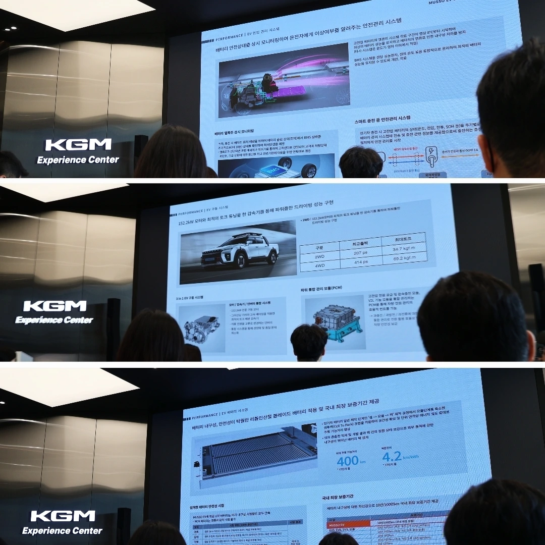 시승회에서는 상품 설명이 우선 진행된다. 차량이 제원이 사전 공개된 후, 공식 시승회가 늦게 시작되었다 보니 내용 자체는 익숙하다. 그 디자인은 도심에 어울리는 미래지향적 이미지, 특히 "로&와이드"한 스타일에 초점을 둔다. 실내 공간에서는 이전 렉스턴의 단점으로 지목되었던 2열 공간을 최대한 넓히고 시트 리클라이닝 기능을 추가했다. 모노코크 기반 섀시지만, 최대 적재 하중 500Kg 달성과 함께 셀프 레벨라이저까지 탑재 가능하다. 차체의 81%가 고장력강으로 동급 최고 수준이며, 전기차의 특수성과 함께 최상의 승차감을 제공해 줄 수 있겠다.