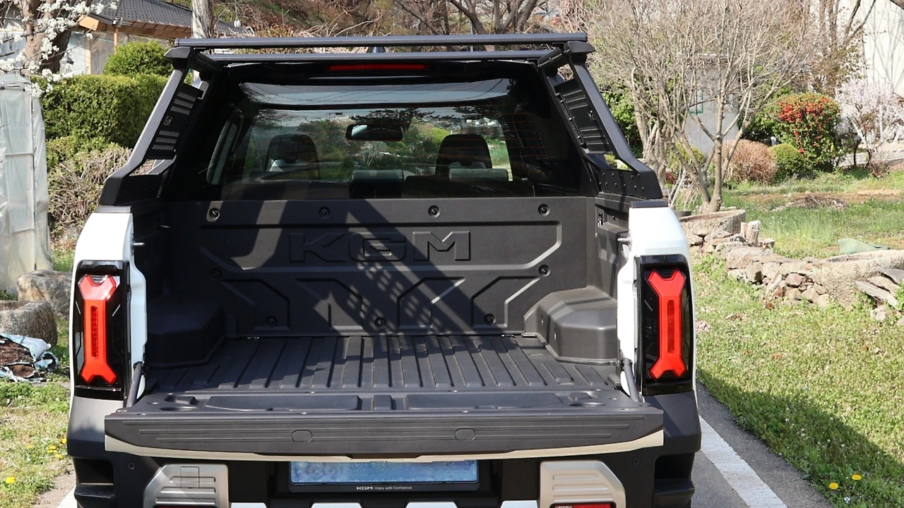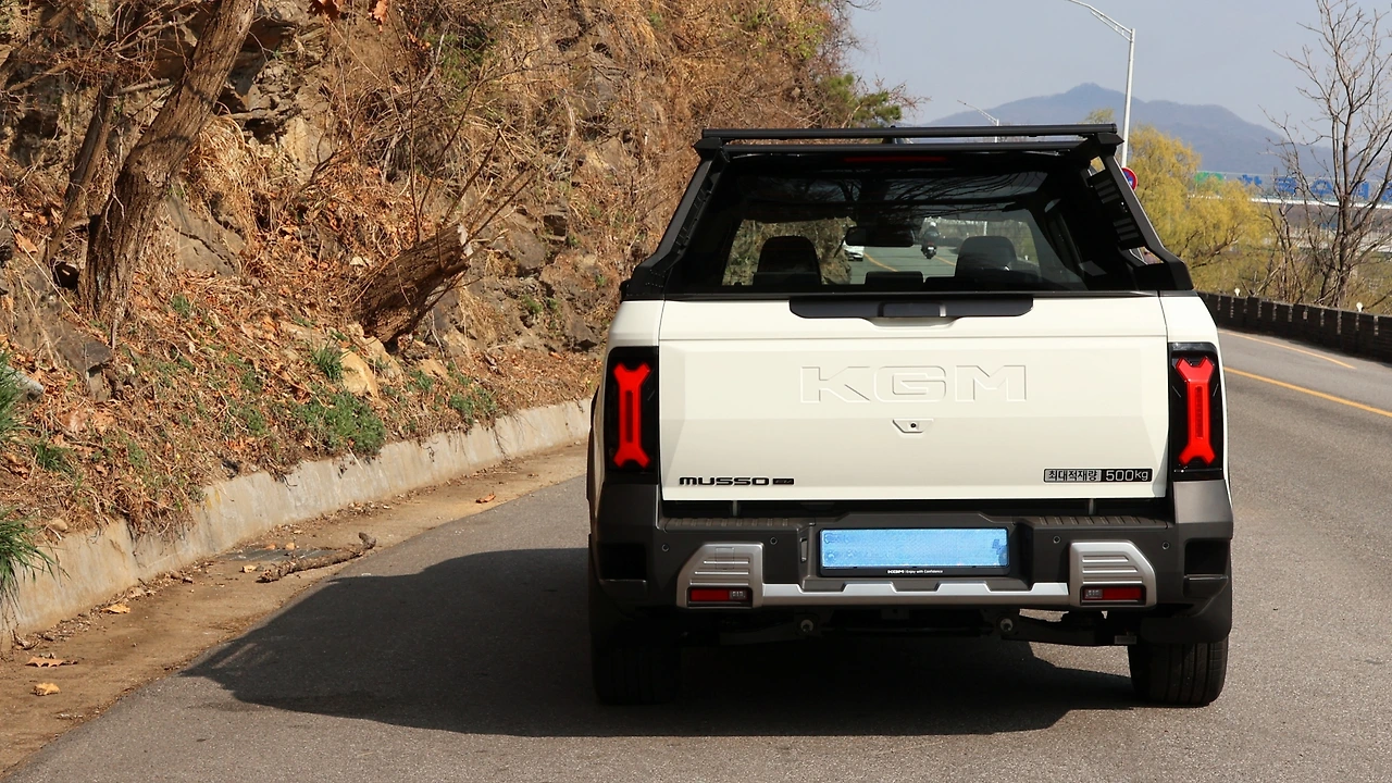 휠 아치 커버에도 액세서리가 추가되어 시선을 이끈다. 무쏘 EV는 휠 인치가 17인치로 차체 크기에 비해 많이 작은 편인데, 블랙엣지 트림은 올블랙 컬러로 제공되니 나쁘지 않다. 후면 디자인은 완전히 새로운 구성이다. 특히 테일램프의 입체감은 마치 컨셉트카의 스타일링처럼 느껴지는데, 테일게이트의 음각 로고와 함께 꽤나 역동적인 분위기를 제공해 준다. 리어 범퍼에는 사이드 스텝 형상을 재현하여 적재함 사용성을 개선했기도 한다. 리어 범퍼에도 역시 두꺼운 로워 가니시가 부착되어 차체 보호는 물론 스타일링 요소의 역할까지 맡아준다.