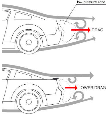 스포일러는 트렁크 리드의 끝단을 연장시킨다. 후류가 시작되는 지점을 'Down wash' 라 하는데, 트렁크 리드가 연장되는 만큼 다운 워시 지점도 이동하게 되는 기대효과가 있다. 자동차의 압력 저항은 차체 뒤에 형성되는 후류의 크기에 비례한다. 립 스포일러는 다운 워시 지점에서 발생하는 와류의 크기를 줄임으로써 후류 영역도 감소시킨다. 이로써 압력저항의 크기도 작아질 것이다. 또, DN8의 테일램프를 보면 커버 위에 돌출되어 있는 물방울 형상을 확인할 수도 있다.