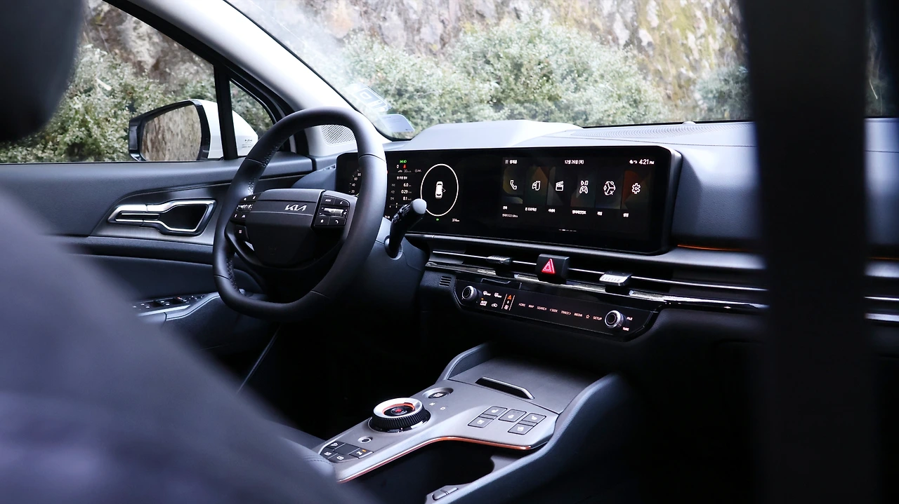 간결함이 느껴지는 실내 디자인이다. 12.3인치 병렬 스크린을 활용한 파노라믹 디스플레이와 HUD가 인포테인먼트를 구축한다. 차세대 운영체제 CCNC가 접목되어 디지털 UI의 완성도가 높아졌다. 센터페시아는 전환 조작 방식을 유지한다. 새롭게 적용된 그립 감지 스티어링 휠은 더블 D 컷 형태의 디자인으로 주행모드 변경 버튼까지 배치된다. 다이얼 방식 기어노브를 포함한 센터 콘솔의 레이아웃은 기존과 동일하다. 대신 우드그레인 소재가 고급스럽고 중후한 느낌을 주며, 엠비언트 라이트는 화려함을 책임진다.