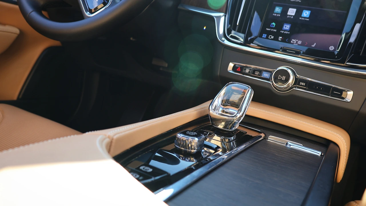 로터리 타입 시동 버튼의 사용감이 만족스러운 편이다. 버튼을 돌리면 엔진도 함께 회전하는 느낌이 직결적이다. 볼보는 친환경 정책의 일환으로 모든 라인업에 BISG를 채택하고 있다. 흔히 48V 마일드 하이브리드라 하는 고출력 시동/발전 유닛으로, S90 역시 탑재되면서 저공해 2종 차량으로 인증을 받았다. BISG 채택으로 인해 시동은 더욱 깔끔하고 정숙하게 걸린다. 아이들링 상태에서 방음 수준이 정말 마음에 들었다. 기어 레버의 경우 별도의 릴리즈 버튼이 없고 브레이크와 함께 조작하면 된다.