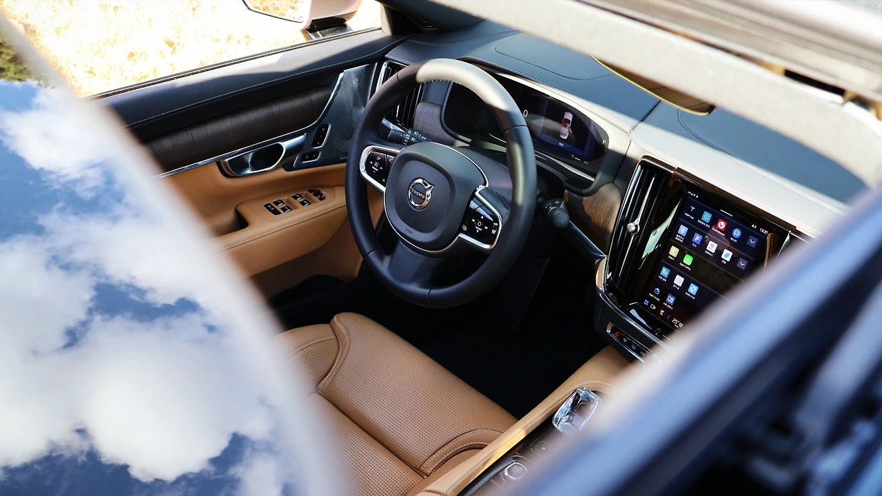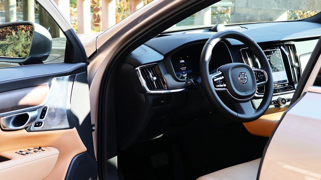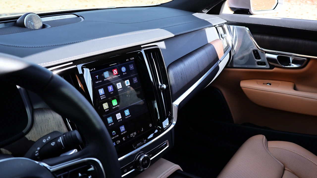 고급스러운 소재로 꾸며냈지만 과시적이진 않은 S90의 인테리어다. 약 12.3인치 크기의 디지털 클러스터와 9인치 세로 배치 터치 디스플레이로 인포테인먼트를 구축했다. T맵과 협력하여 제작한 한국형 내비게이션과 FLO, 음성인식 기능 등 미디어 서비스는 볼보가 소구하는 차별점이다. 세로로 배치된 에어벤트와 각종 실내 소재가 고급스러움을 더한다. 특히 울트라 트림은 오레포스사에서 가공한 크리스탈 기어노브가 채택되기도 하며, 가죽, 차콜 헤드라이닝과 함께 실내를 마감하는 피치드 오크 데코가 특유의 북유럽 감성을 강화했다.