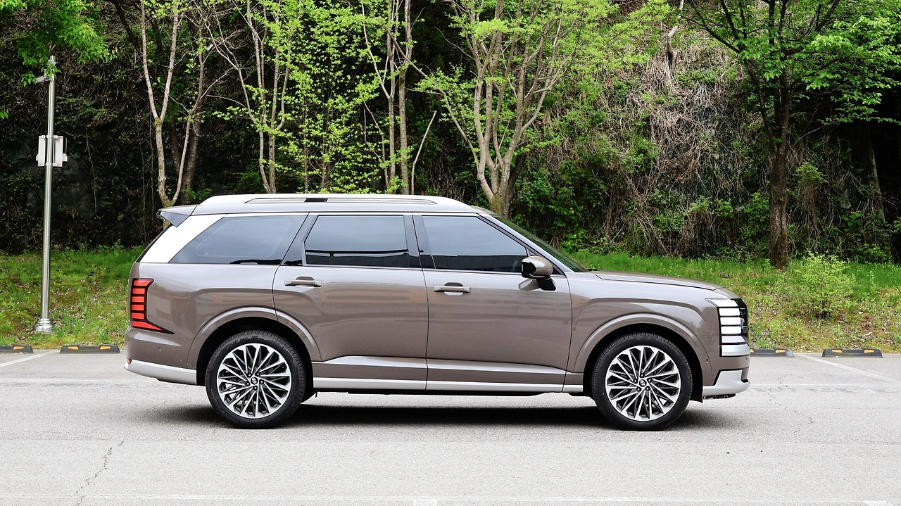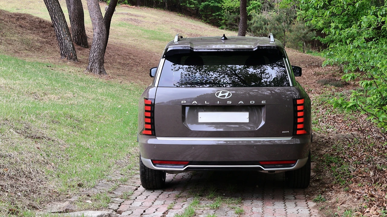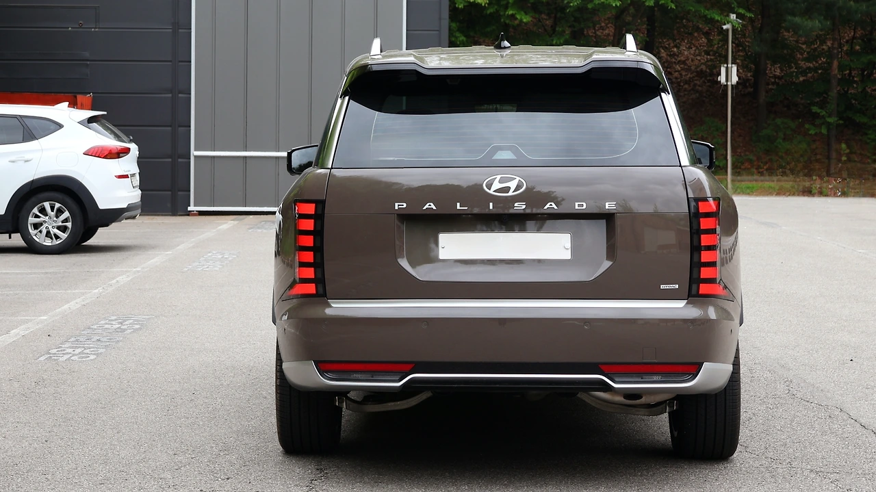 다른 모델과의 가장 큰 차별성은 역시 21인치 크기의 대구경 알로이 휠이다. 현대차의 플래그십 모델들에 적용되는 고풍스러운 디자인으로, 21인치의 크기가 돋보이지 않는 점은 신형 팰리세이드의 커다란 덩치를 실감 나게 한다. 후면 디자인의 경우 테일램프를 양측에 배치하면서 테일게이트에 의한 끊김이 없다. 자연스럽고 매끄러운 형태로 남는다. 범퍼 하단부는 전면과 마찬가지로 색상 마감이 참 고급스러운데, 덕분에 전체적인 분위기 자체가 상향되는 효과가 있다. 언더 가니시 색상 마감은 최상위 캘리그래피 등급만의 차별화이기도 하다.