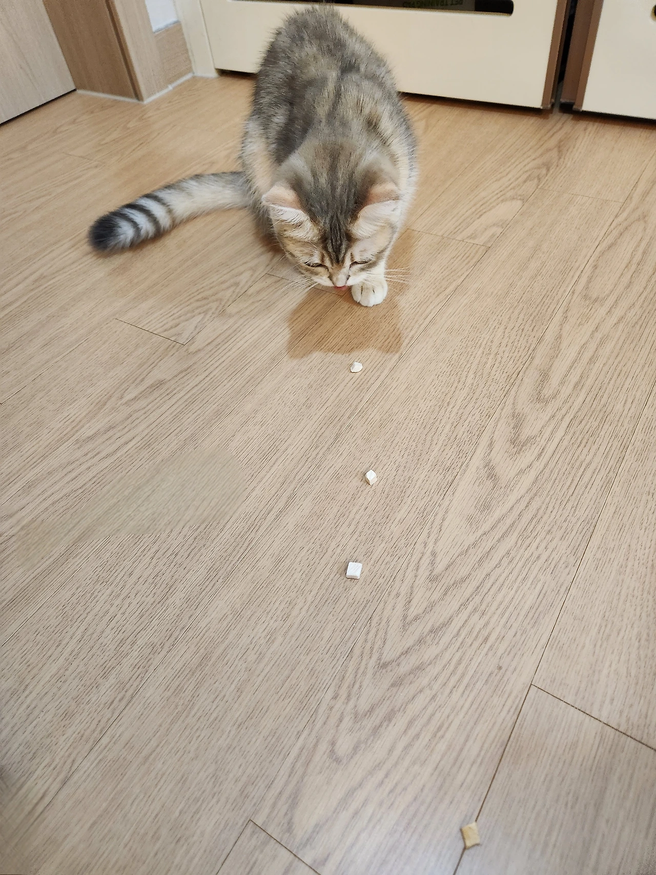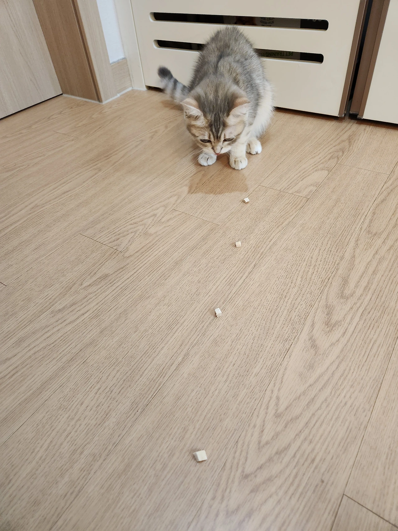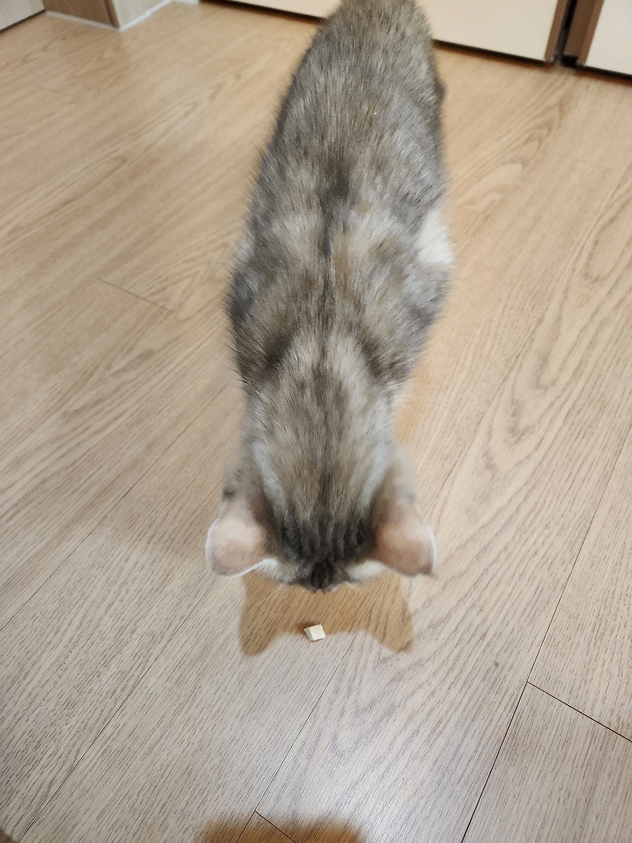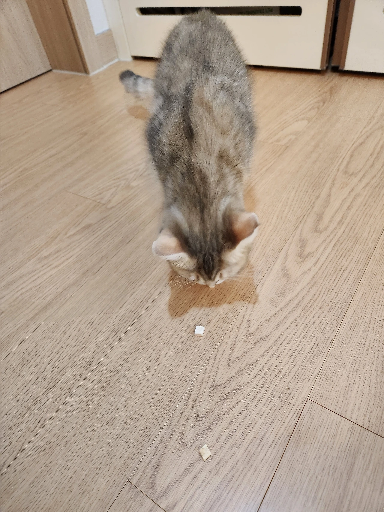 집사는 불혹의 나이에도 순간순간 동화 속에 살고 있는 듯한 착각에 들곤 한다. 오늘은 루루에게 간식을 주다 헨젤과 그레텔을 떠올린다. 집에 오는 길을 잃지 않기 위해 빵조각을 두었던 헨젤과 그레텔 남매처럼 간식큐브를 하나하나 두는 집사와 루루가 있다. 루루는 이 간식 끝에 있을 과자집을 상상하며 따라오고 있는 것일까?