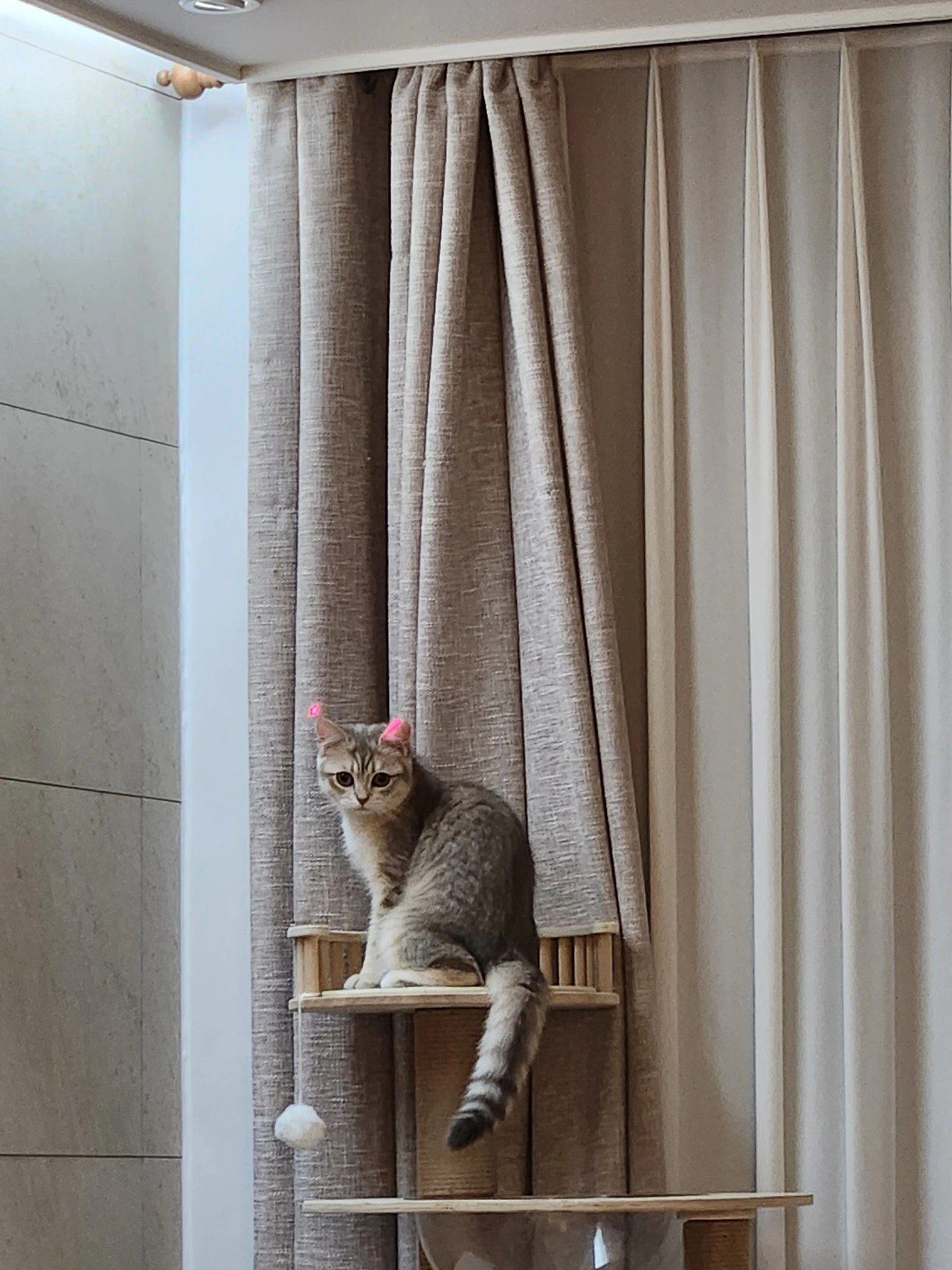 처음으로 캣파이더맨이 등장했던 날은 루루가 우다다의 흥분을 좀처럼 가라앉히지 못하던 날이었다. 결국 캣타워 맞닿아 있는 커튼을 타고 올라 천장을 찍었더랬다. 그래봤자 제 키(?)의 두 배 정도 높이이지만 제 몸의 무게를 오로지 발톱에 싣고 그것에 의지하여 천장을 향해 오르는 루루의 기이한 행동에 가족 모두 할 말을 잃었다.
