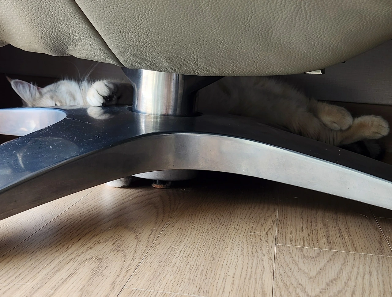 여름 한낮 정남향집은 불지옥이 따로 없다. 덥다 더워. 우리 털뭉치 아가씨는 얼마나 더울까. 우주선에 녹아있는 그녀를 보며 안쓰러운 마음 가득이다. 루루도 제 살길을 찾느라 요 며칠 집안 여기저기를 탐색하다 가장 시원한 곳을 찾아낸다. 테라스 수도의 물길이 흐르며, 바깥바람이 불어 들고 항시 그늘이 져있는 시원하면서도 안락한 공간, 바로바로 안락의자 밑. 금속인 의자 다리에 몸을 밀착시킨다. 죽부인을 안아 더위를 물리쳤던 옛 어른들의 지혜를 자연습득한 것인지 루루도 슬기롭게 여름의 열기를 식히고 있다. 천잰데?
