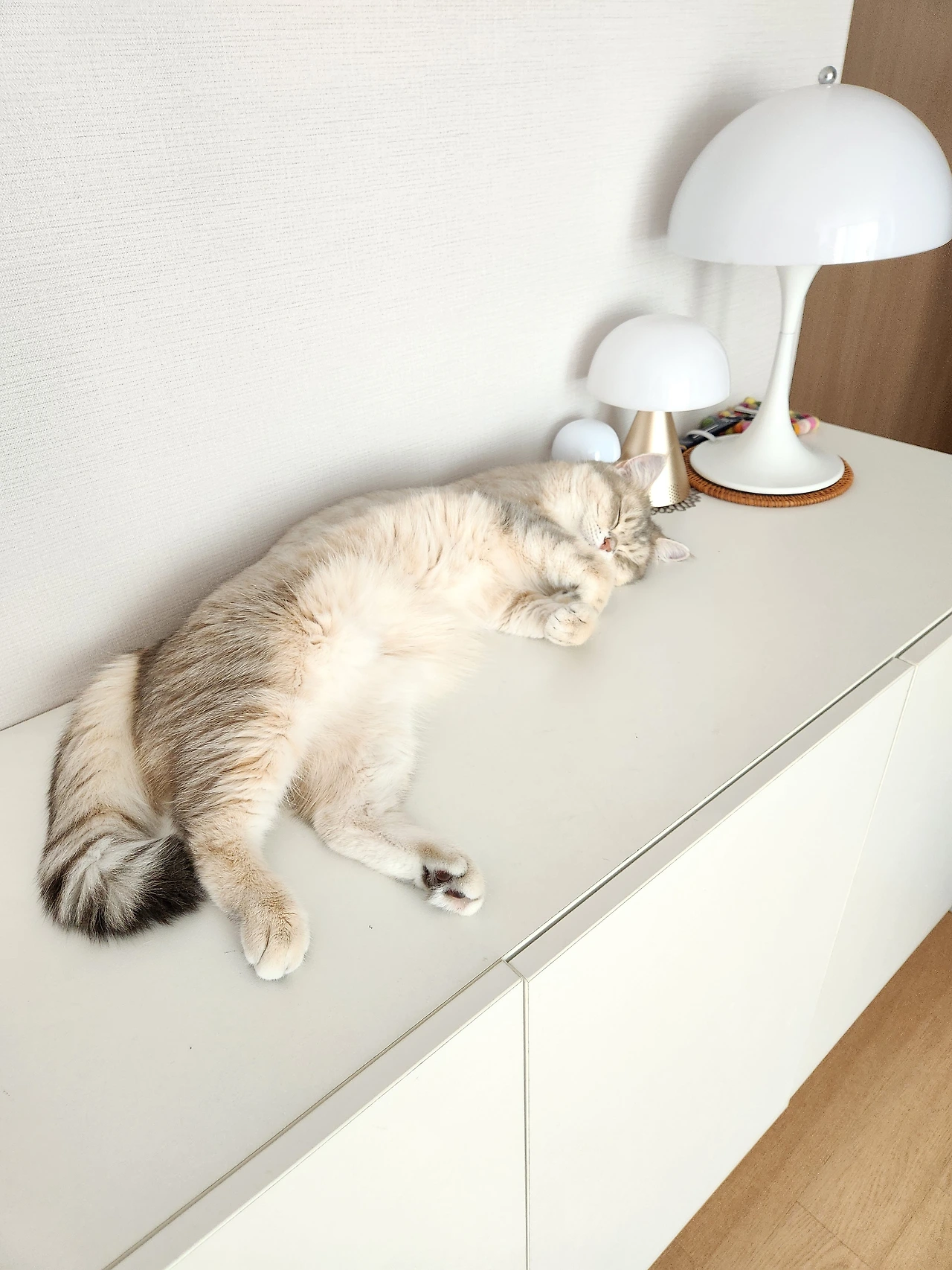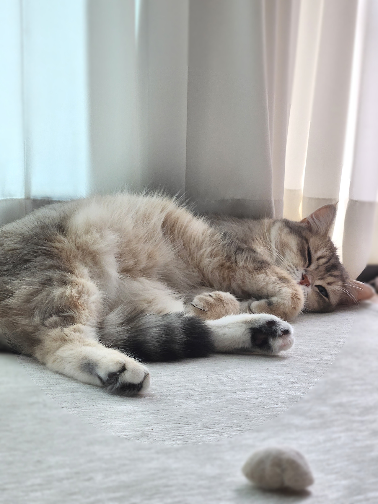 집사가 한 숟갈 한 숟갈 먹여주는 (약 탄)밥도 배 뻥하게 잘 드셨겠다 안약도 잘 넣었겠다 눈도 잘 보이고 잘 떠지겠다 루루는 행복한 오후 낮잠 중이다. 요즘 자다가 잠꼬대를 하곤 하는데 그 모습이 집사는 그리 귀여울 수가 없다. 무서운 꿈을 꾸는 건지, 재미난 꿈을 꾸는 건지 알 수가 없어 다가가 쓰담쓰담해 주면 다시 쿨쿨 자는 녀석.