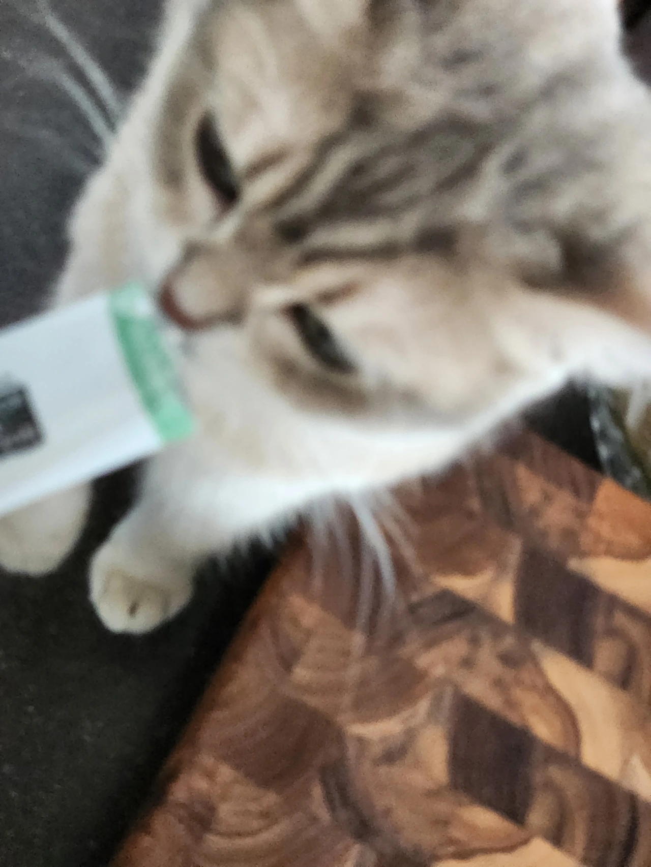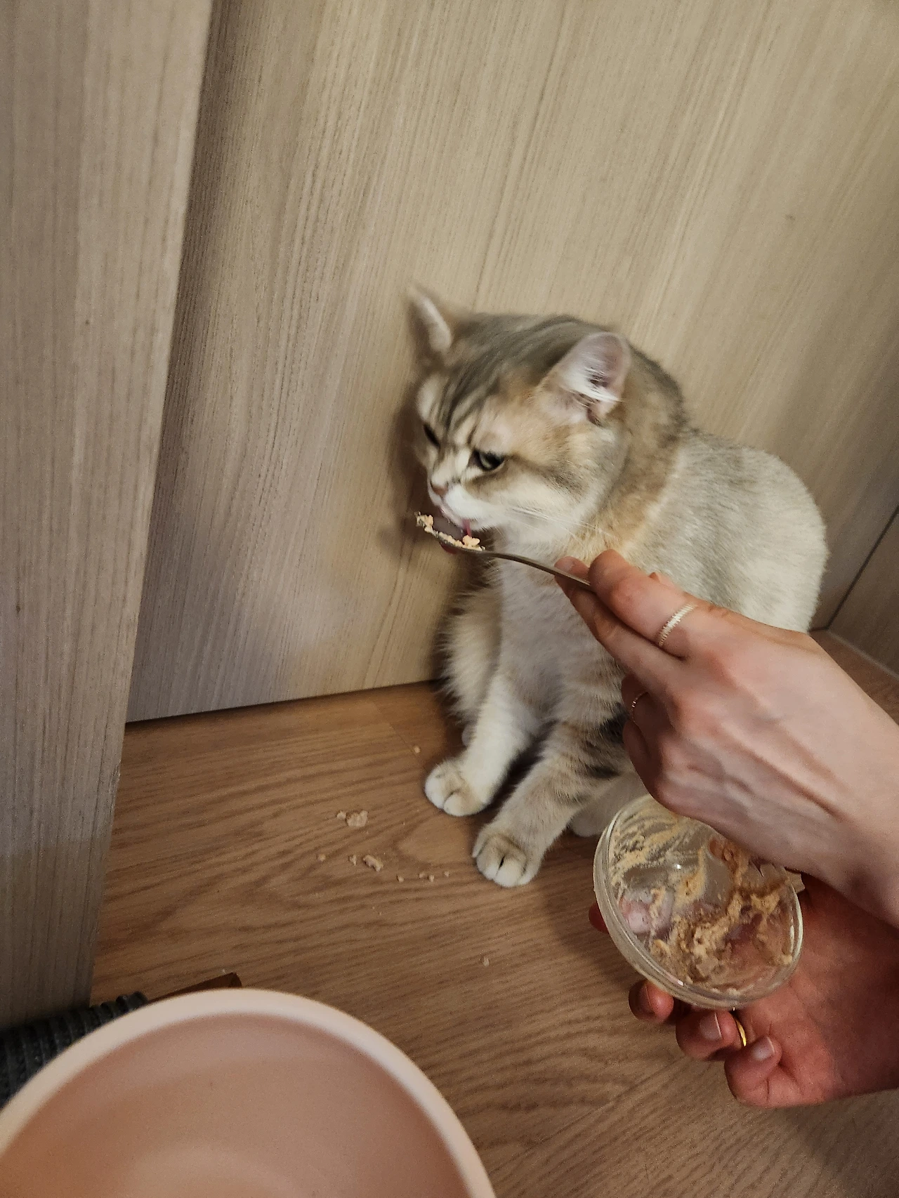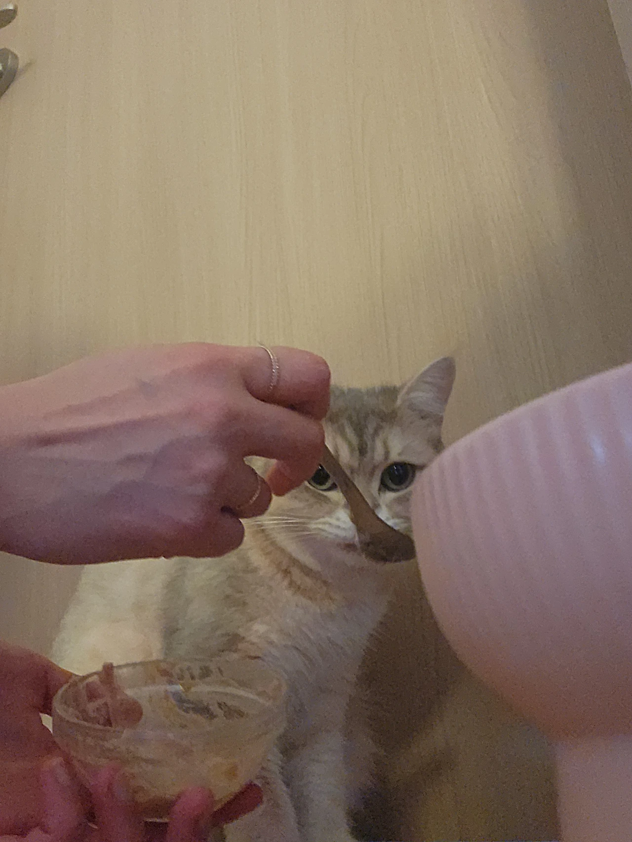 이번에는 미각 교란 작전에 돌입해 보기로 한다. 루루가 좋아하는 냥치츄르를 하나 준비해, 투약보조 습식캔에 약을 섞어 다가간다. 이미 냥치츄르를 보고 고릉고릉고르릉 골골송 시동을 걸고 다가와 등을 동글게 말아 꼬리로 툭툭 치며 애정공세를 퍼붓는 녀석. 츄르 한 입을 먹이고 약을 섞은 습식을 한 숟가락 준다. 쓴맛이 느껴지기 무섭게 좋아하는 냥치츄르를 쭉 짜서 주니 냠냠 맛있게 잘 먹는다.