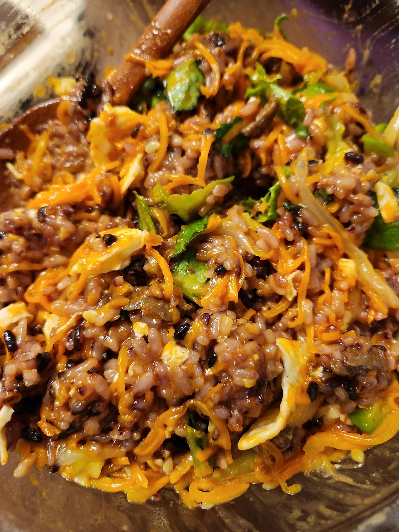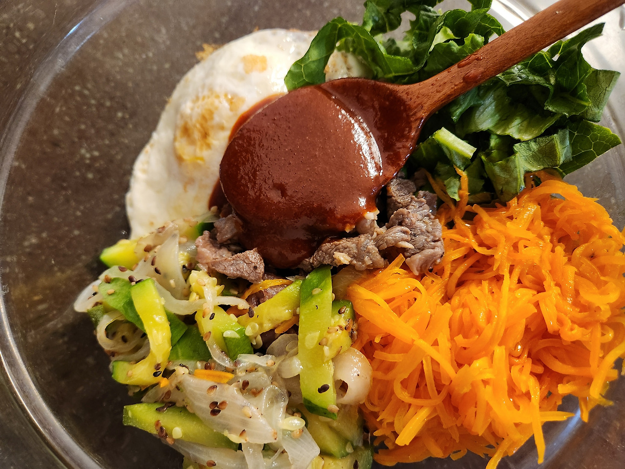 소고기 밑간을 해 재워 두고 당근, 양파, 애호박을 손질하여 각각을 소금 조금 넣어 휘리릭 볶는다. 고추장에도 참기름과 깨, 버섯가루, 매실청 등을 조금 더해 감칠맛이 나는 양념장을 만들어 두고, 계란후라이를 반숙으로 부친다. 반숙후라이의 노른자를 툭 터트려 비빔밥에 서걱서걱 비벼 먹는 맛을 아는 남매의 특별 요청 사항인 반숙은 특히나 심혈을 기울여 부친다. 설거짓거리를 줄이려 하나의 프라이팬에 색이 연한 채소부터 볶고 볶고 부치다, 마지막으로 고기를 볶는 것으로 또월의 비빔밥은 준비 끝. 색도 곱고 준비도 쉬운데 항시 맛을 보장하니, 또월요일 저녁의 메뉴로 적당하다.