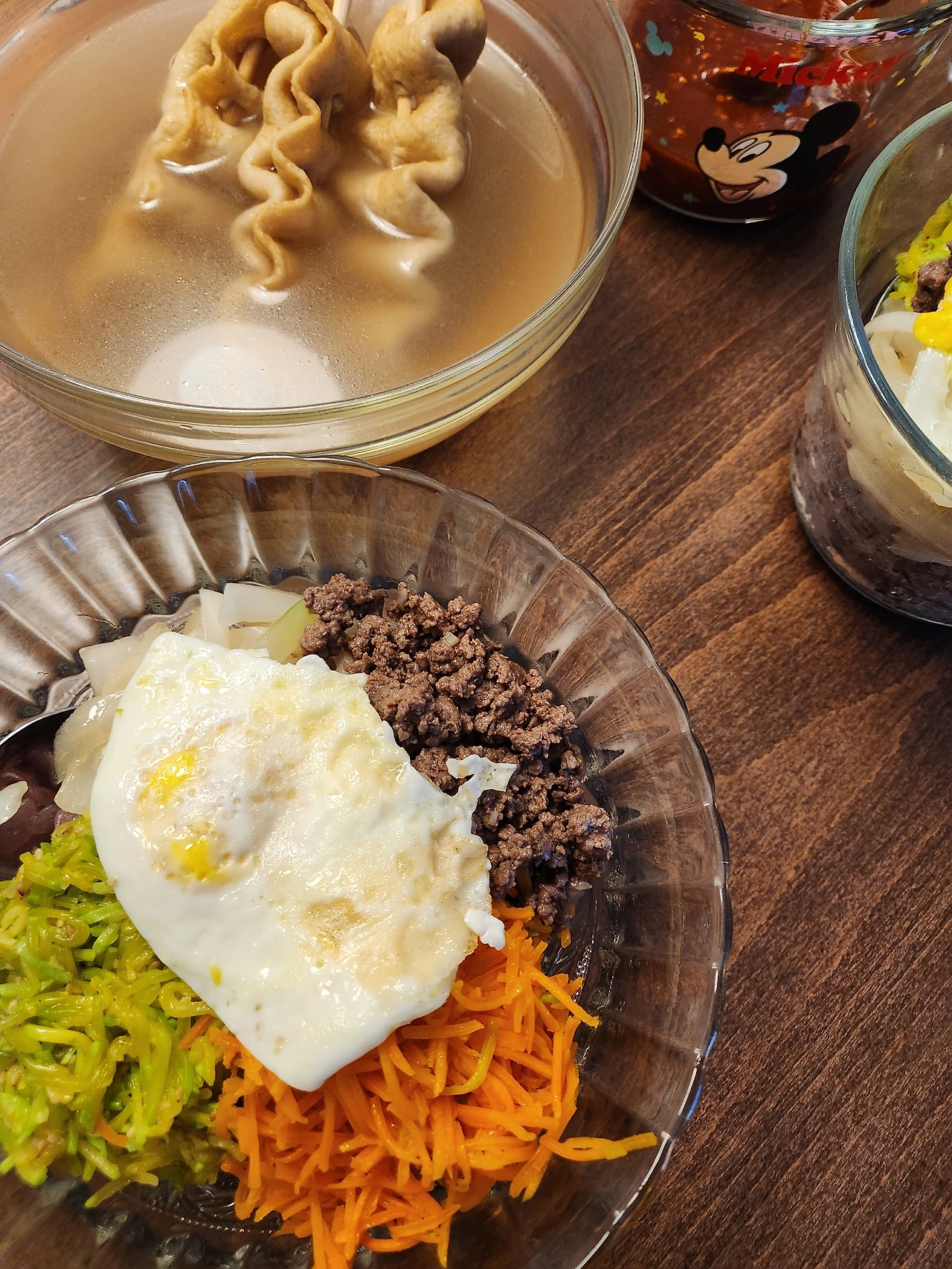 비빔밥이 간단한 것 같지만 얼마나 손이 많이 가는 음식인 줄 아냐며 보이지 않은 정성을 알아봐 주는 남편도 고맙고, 양파와 당근을 볶은 자연의 단맛이 이리도 맛있을 일이냐며 건강한 입맛과 식습관을 쌓아가는 아이들도 고마운 시간.건강하고 든든하게 채운 밥심으로 또 일주일을 잘 살아낼 일이다.