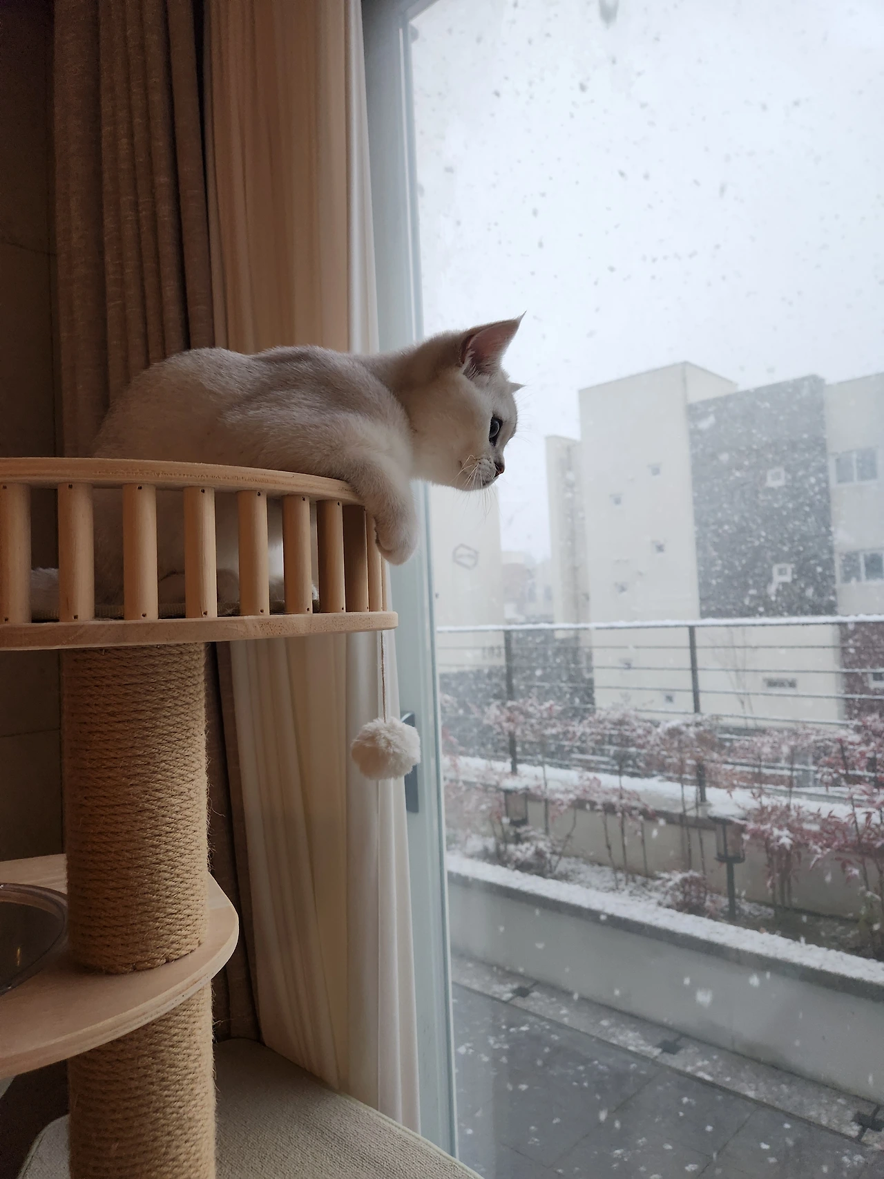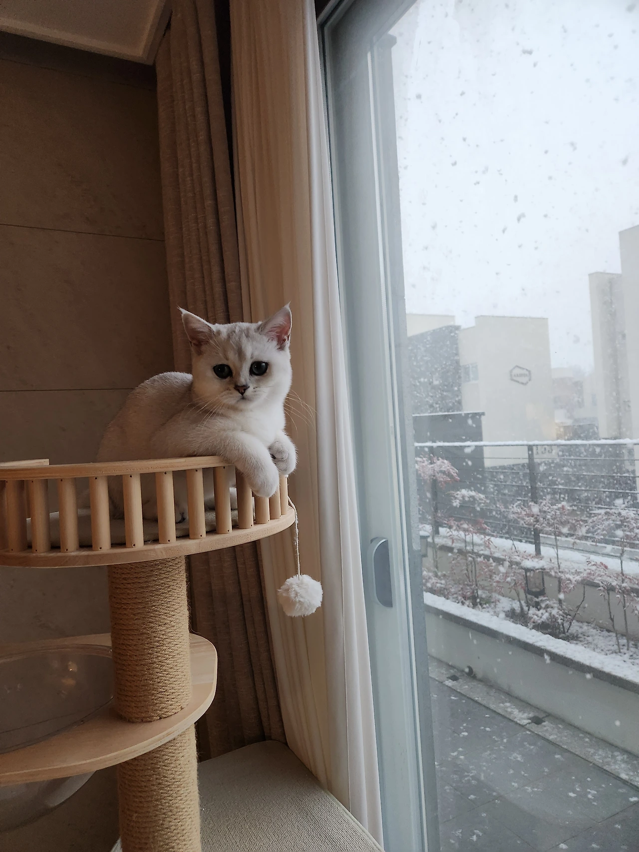 '눈 오는구나? 루미는 많이 신났구먼. 암~, 저 나이는 세상만사 궁금한 것 투성이고, 흩날리는 눈송이에도 꺄르르 웃음이 날 나이이지~ 즐겨라, 아가 냥이. 훗'