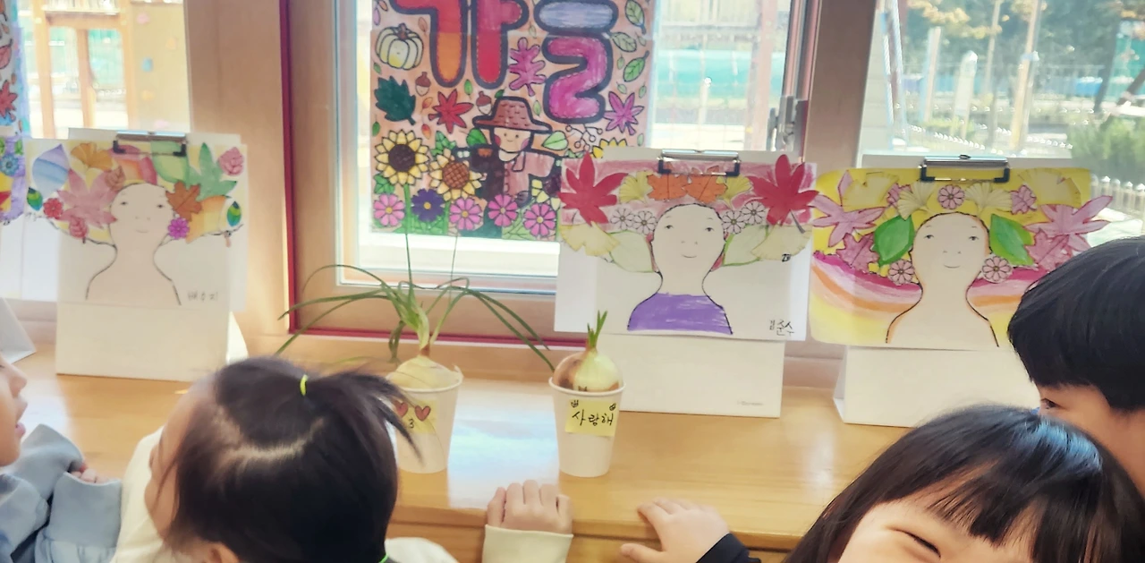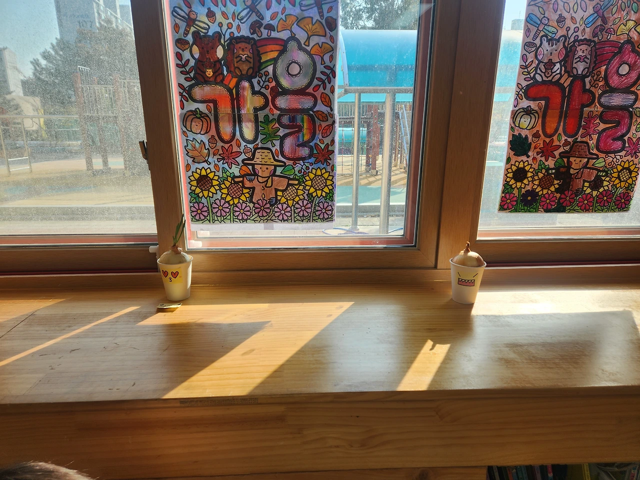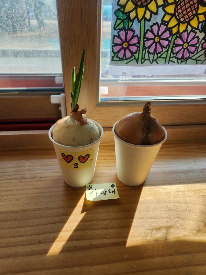 등교와 동시에 양파에게 인사를 건네는 귀여운 아이들이 주말 새 싹을 틔워 올린 화가나양파의 성장에 감동했던 월요일 아침이었다.