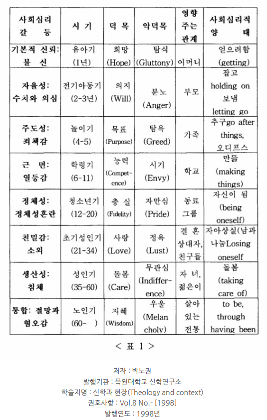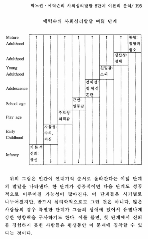 에릭슨의 심리 사회적 발달 이론에 따르면, 인간에게는 미리 정해진 8개의 발달 단계가 있는데 모든 사람들을 유전적 기질을 바탕으로 사회적 환경과 상호작용하면서 각각의 단계를 거치게 된다. 각 발달 단계에 따른 발달 과업을 잘 해결하고 완수하면 그 핵심적 가치를 습득하며 정상적이고 건강한 개인으로 발달해 나갈 수 있다는 것이다.