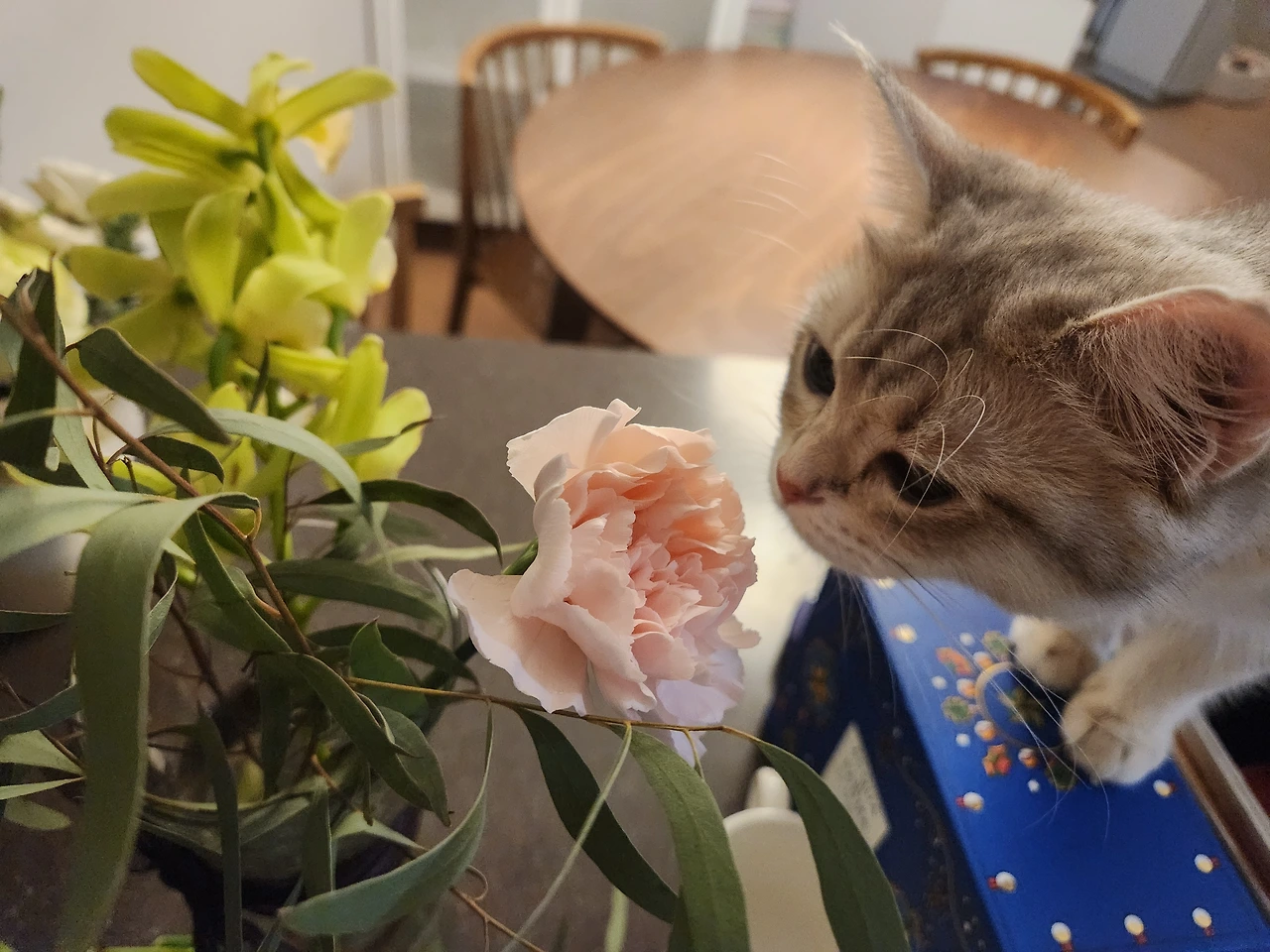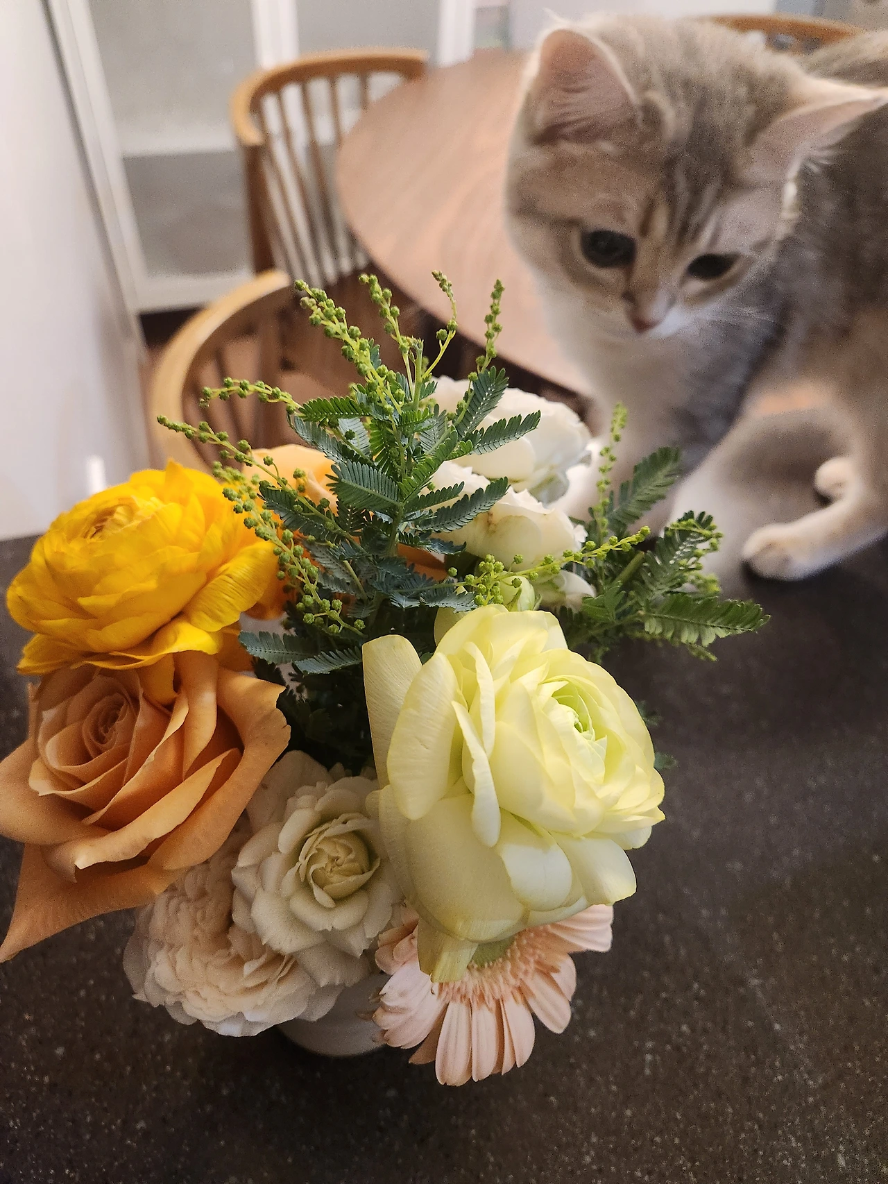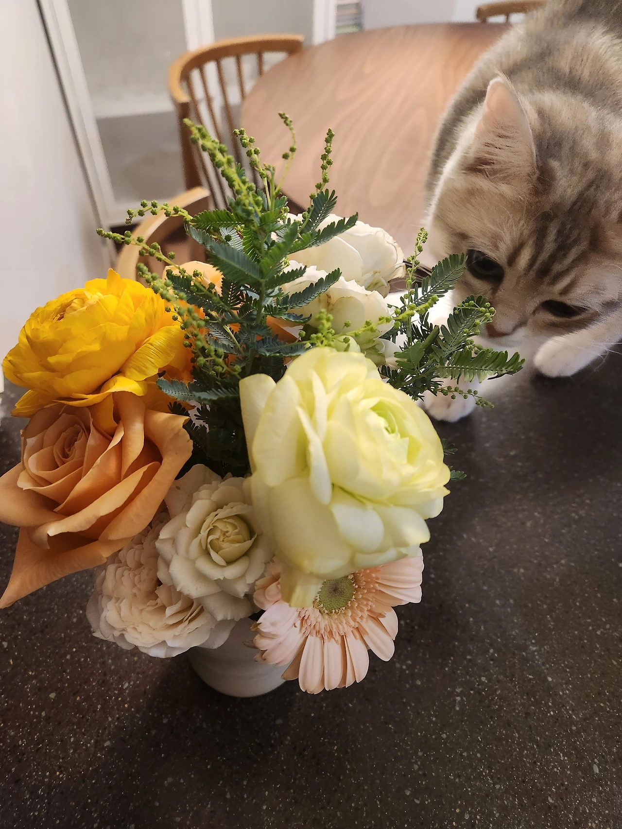 호기심 많은 우리 집 아가씨는 낯선 것에 경계가 심한 편인데, 꽃 좋아하는 집사를 닮아 그런지 어쩐지 꽃에게는 그런 것 같지가 않다. 다가와 킁킁킁킁 냄새를 맡으니 거베라와 장미는 고양이에게도 안전한 꽃이라고는 하지만, 괜스레 불안하다. (백합과 튤립, 수국, 카네이션 등은 소량으로도 고양이가 치명상을 입을 수 있다 하니, 더더욱 조심. )얼른 정리하여 집사전용 영역으로 꽃들을 이동시켰으니 괜찮을 줄 알았다만...