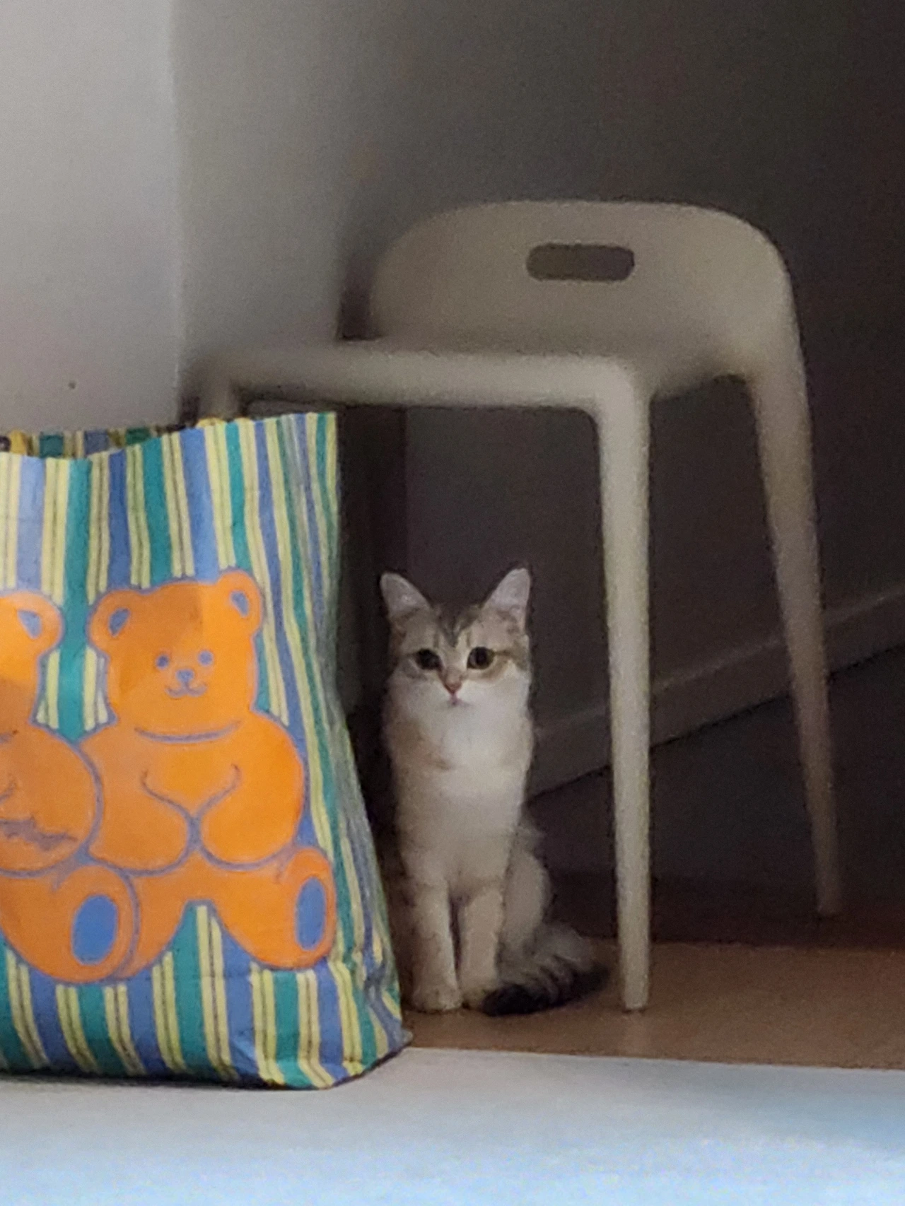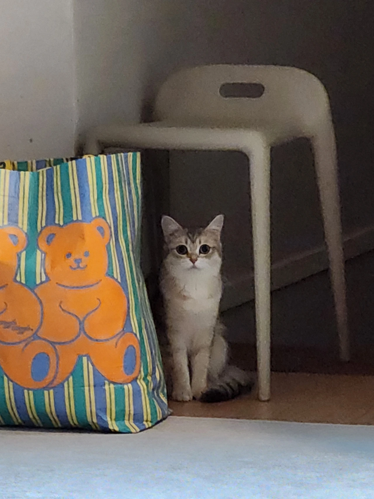 이제 묘생 9개월 차에 접어둔 루루는 십대 연년생 남매의 밤을 지킨다. 둘째의 약한 기관지를 염려하는 마음에 침실 문을 닫아두니, 잘 밤에 아이들이 꿈나라로 가고 나면 굳게 닫힌 방문 앞에 서 문과 문틀 사이에 머리를 박고 야옹, 야-아옹 루루가 운다. 눈앞에 성인 집사 둘이 있는데도 애들 방문 앞에 망부석이 되어 있는 루루.루루는 애들이 더 좋은가 봐,,,,, 살짝 밀려오는 섭섭한 마음과 함께 스윽 문을 열어준다. 그러면 밤사이 루루는 잠든 아이 집사들의 곁을 지키다가 나와서 놀곤 하는 루루. 2층 침대를 오르내리고, 가끔은 집사의 머리맡에 쥐돌이 인형이나 머리끈을 물어다 두기도 하면서밤을 보낸다.