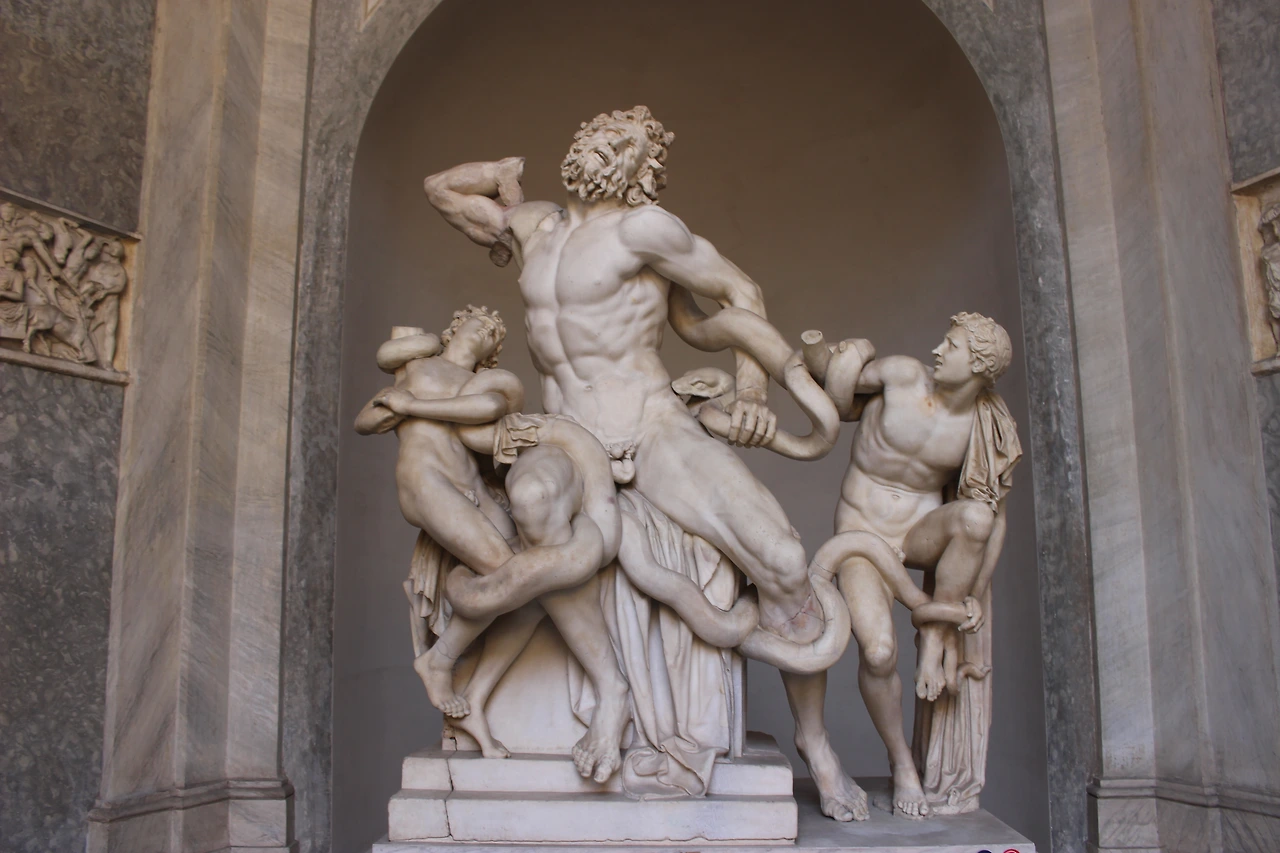 라오콘 군상을 모르는 사람은 없을 것이다. 바티칸의 3대 조각 중 하나인 이 라오콘 군상은 그리스로마신화를 읽어본 사람이라면 다 한 번 쯤은 보았을 것이다. 예언자 라오콘은 트로이의 목마를 보고 불길함을 느껴 이 목마가 트로이에 재앙을 가져올 것이라고 경고했지만 그 누구도 듣지 않았고, 아테네를 지지하던 포세이돈이 보낸 바다뱀에 의해 죽고 만다. 라오콘 군상은 바다뱀에게 붙잡혀 서서히 죽음으로 다가가는 라오콘 부자의 모습을 아주 생생하게 그려내고 있다. 겁에 질린 표정과 경직된 근육은 아주 생생하고 노골적이라 헬레니즘 미술의 정수로 평가받는다.