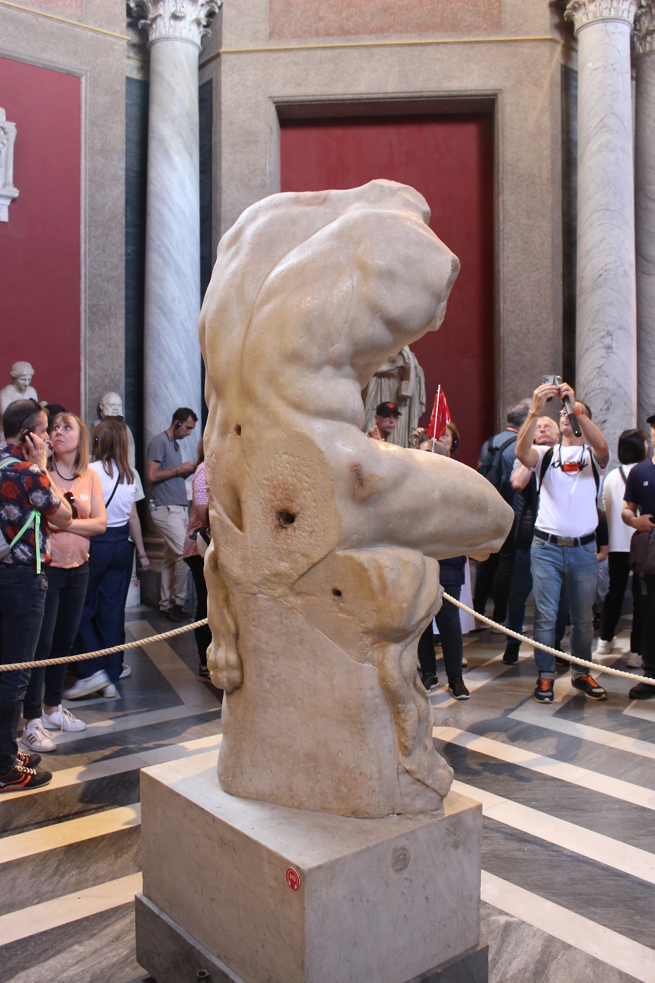 실내로 들어가 사람들로 꽉 찬 복도를 지났다. 바닥에 당시 제일 귀했던 청금색으로 장식된 타일도 구경하고, 이집트에서 가져온 조각상도 보았다. 그리고 앞에서 언급한 라오콘과 베드로 성당의 피에타와 함께 바티칸의 3대 조각으로 꼽히는 토르소를 보았다.