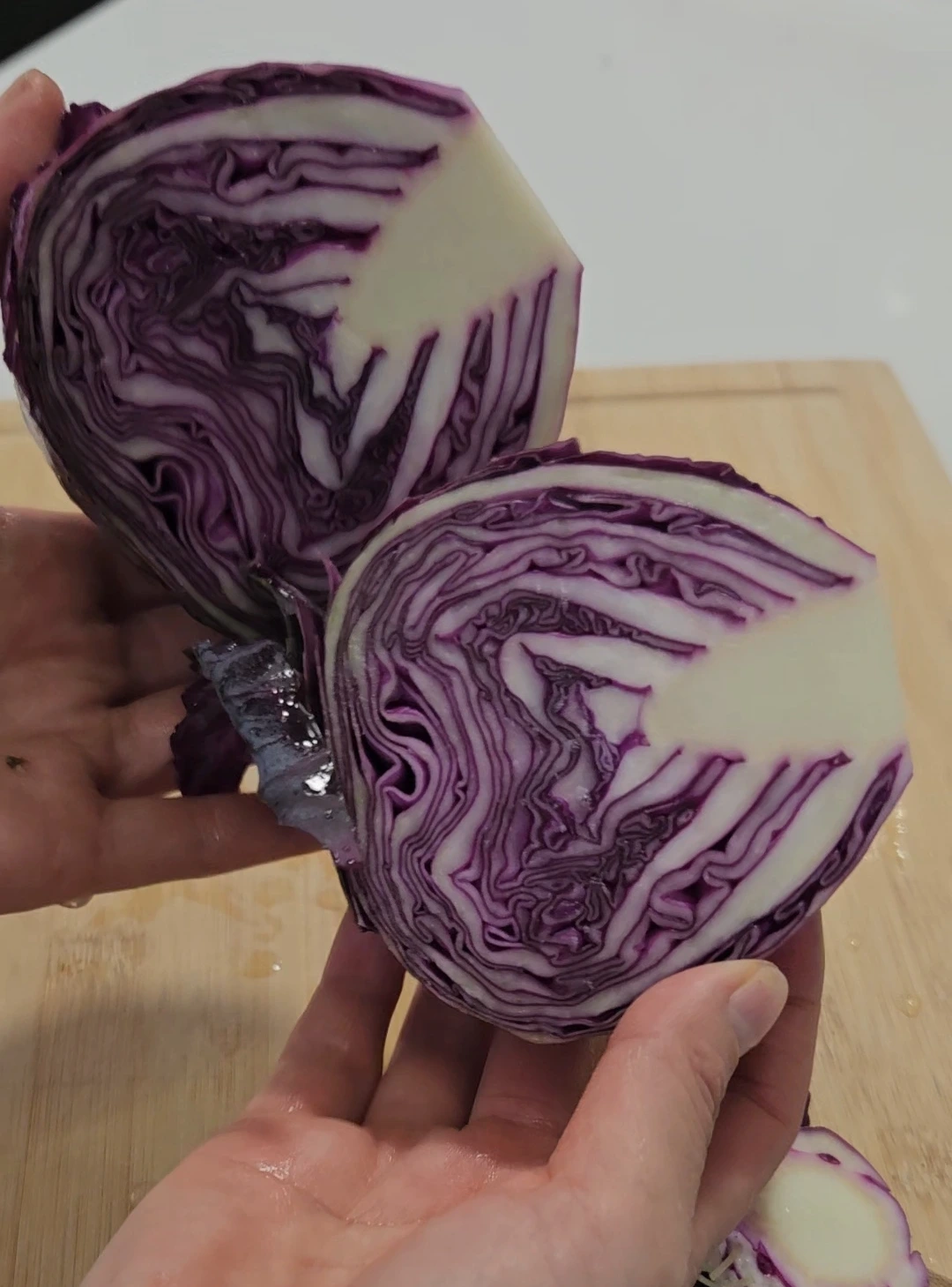 자홍빛 양배추 속이 오밀조밀 차있고, 칼이 지나간 자리마다 진한 양배추 색으로 물들었다.