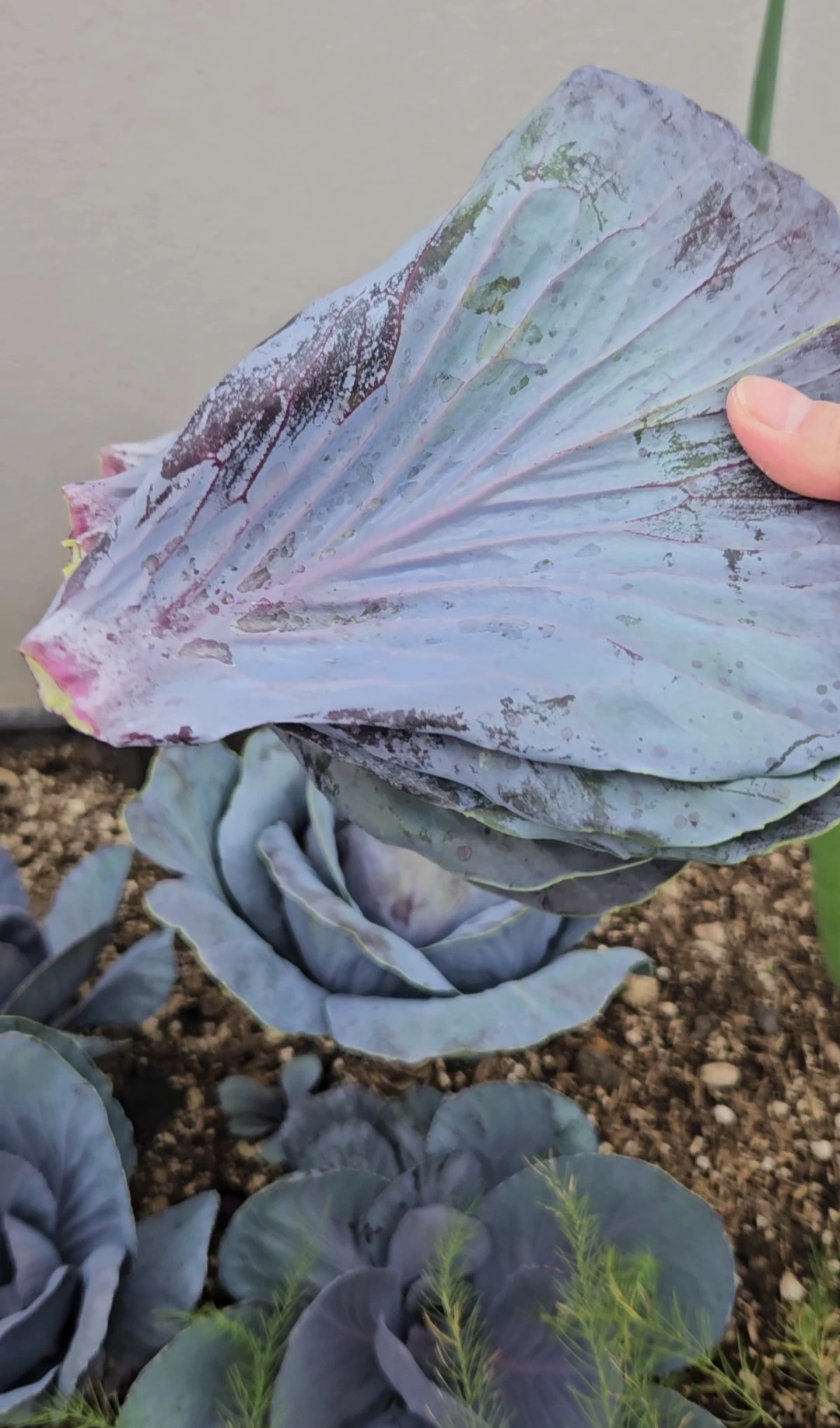 어차피 결구는 가운데서 이루어지니 넓적하게 자라나는 겉잎을 수확해도 양배추의 성장에는 방해가 되지 않는다.