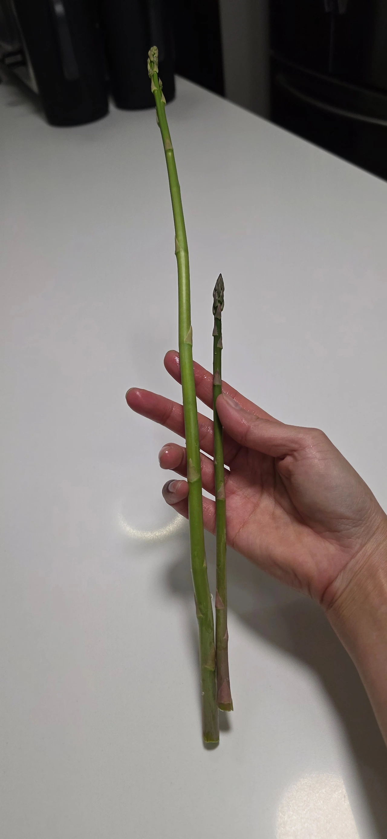 톡! 소리와 함께 싱싱한 아스파라거스들이 엄마 손에 쥐어져있었다.