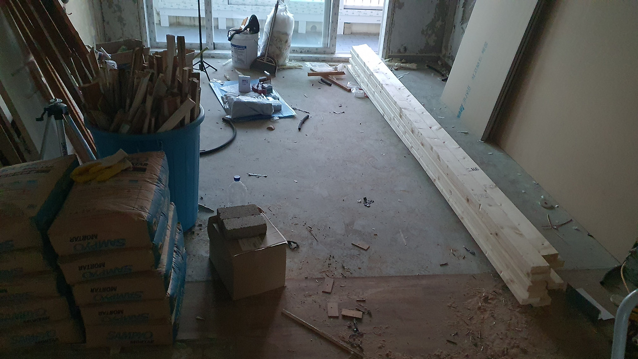 둘이서 열심히 작업을 하고 점심을 든든하기 먹었다. 곧 있을 자재 양중에 힘을 쏟아야 하기 때문이다. 자재의 양은 얼마 되지 않는다. 욕실에 들어갈 레미탈과 현관에 가벽을 세우기 위한 목재 두 단 정도와 석고보드 서너 장 그리고 MDF와 시멘트보드 한 장.