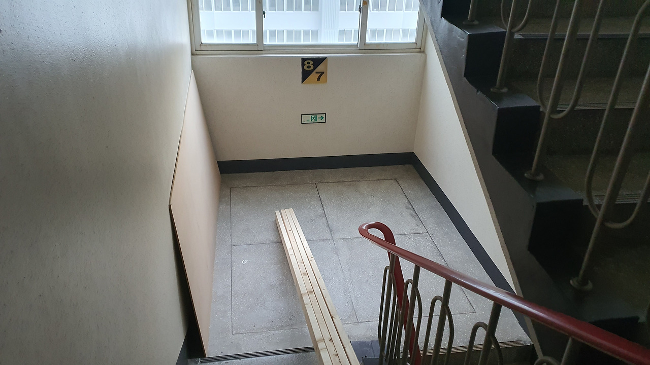 그렇게 시작된 계단 양중. 아내와 함께 열 두장의 목재 중 네 장을 들고 계단을 올랐다. 첫 번째 양중이라 손발이 살짝 맞지 않아서 1층에서는 꽤나 버벅거렸다. 그리고 차츰 손발이 맞아지고 순조롭게 약 7층까지 올랐다. 하지만 순조로움은 거기서 멈춰버렸다. 아내의 체력이 방전됐기 때문이다. 땀을 뻘뻘 흘리며 올리는 아내의 모습에 마음이 짠해졌다. 그렇게 7층에서 멈춘 후 아내를 좀 쉬게 하기 위해서 혼자 내려가서 MDF 합판을 양중했다. 다행스럽게도 층과 층 사이의 통로가 넓어서 합판을 수월(?)하게 돌릴 수 있었다.