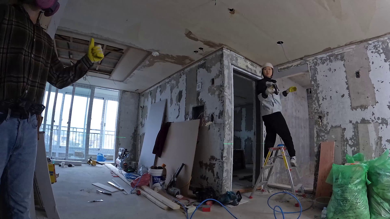 상황이 재밌는지 슬로모션을 하며 가져다 댄 곳은 철거를 하면서 끝이 깨져버린 석고보드가 있는 곳이었다. 아내는 혼자서 이걸 모양대로 만들고 있었던 것이다. 조각을 완전히 붙였을 때는 엄청난 희열이 분위기를 감쌌다. 직선도 아닌 저 곡선을 대보고 갈아내고를 반복하면서 만든 작품이었다. 내가 혼자서 뚝딱거리는 동안 이걸 하고 있었을 아내의 모습이 상상이 되어서 너무 웃겼던 순간이었다. 천장에 올려붙인 석고보드는 타카로 박지 않았는데도 멀쩡히 붙어있는 모습에 "얼마나 완벽하게 만들었길래 떨어지지도 않네"라며 농담과 대단하다는 칭찬을 해줬다.
