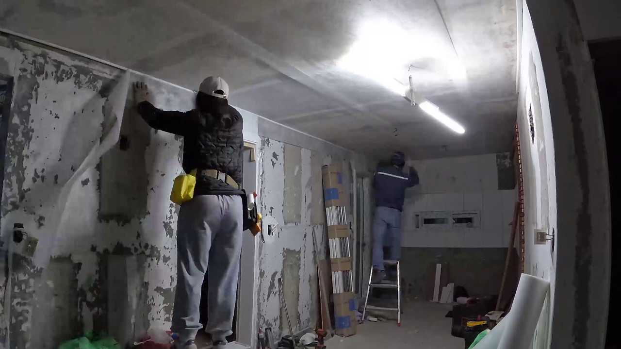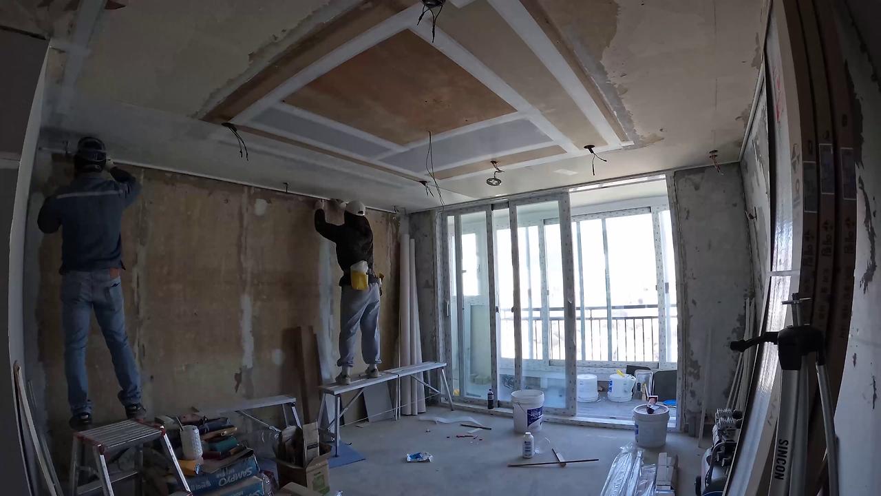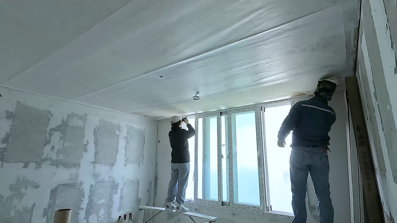 부직포 시공은 늦은 밤까지 진행됐다. 분명 바깥에서 들어오는 햇빛만으로도 잘 보였는데 어느새 빛은 사라지고 어둑어둑 해가 져버렸다. 마지막 남은 곳인 주방을 남겨두고 우리는 주방의 식탁등을 임시 작업 조명으로 사용했다. 거실과 주방의 천장이 길게 연결되어 있는 구조다 보니 한 번 재단할 때 엄청난 길이를 재단해야 했다. 재단은 어찌저찌 했지만 그 부직포를 들고 붙여 나가는 과정은 정말 쉽지 않았다. 부직포를 잡으랴 발판과 사다리를 옮기랴 잘 붙을 수 있게 여기저기 손보랴 정신없는 과정들이 지나갔다.