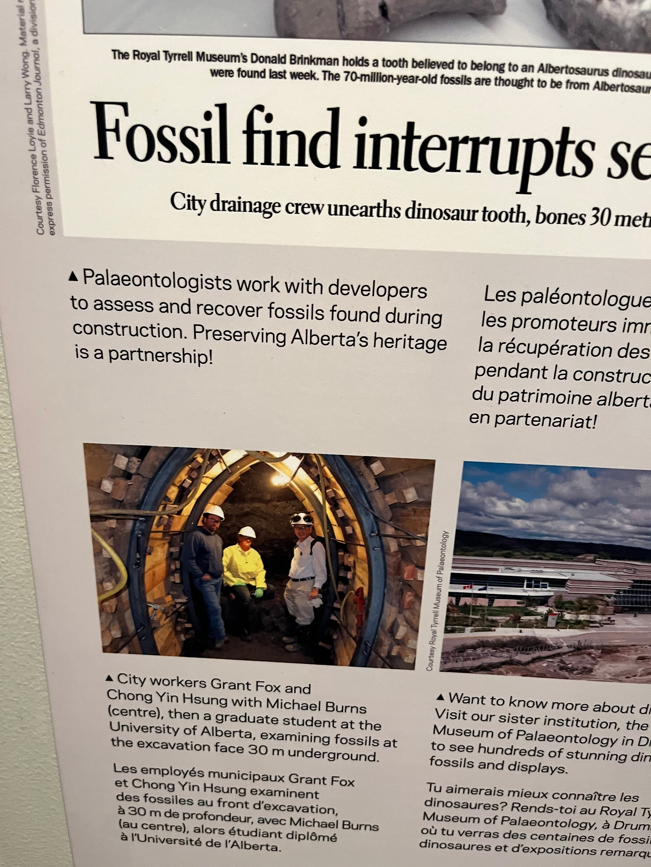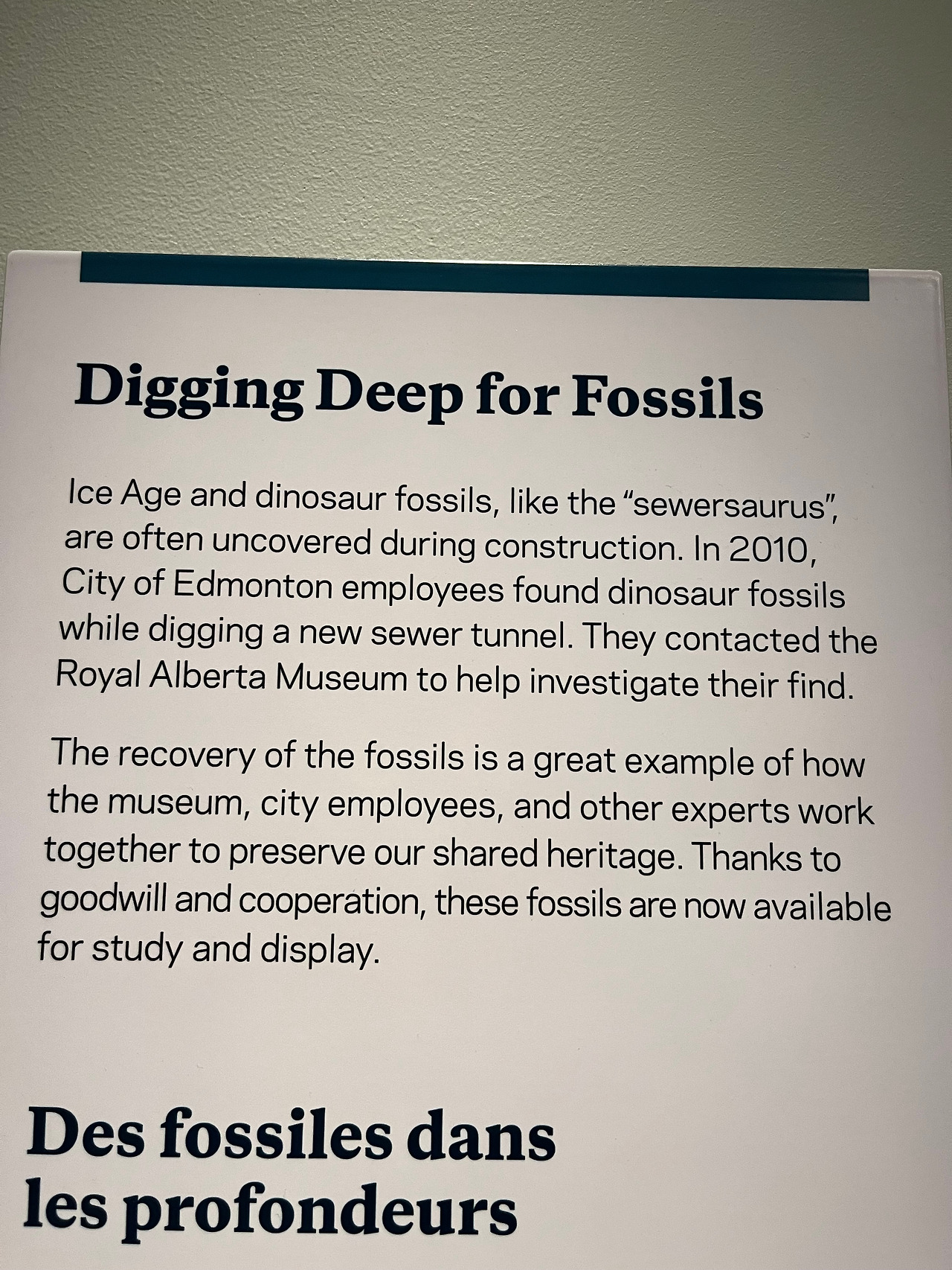 하수구사우르스 공룡뼈 옆에는 화석 발견시 행동 요령이 친절히 명시되어 있다. 발견한 그자리에 그대로 두고 사진 찍어서 앨버타박물관으로 연락 주면 발견한 화석이 얼마나 중요한 건지 평가해 주겠다고 한다.