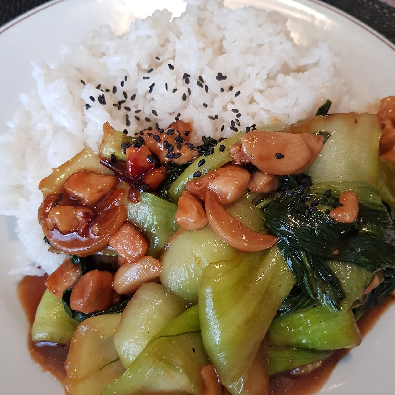 포크찹용으로 뼈가 붙어 있는 돼지고기에서 살만 발라내어 썰고 미림, 마늘가루, 맛소금으로 밑간 해 둔 뒤에 감자 전분을 한 숟갈 넣어 뒤적거려 놓고 커다란 웍이 없는 고로 가진 냄비 중에 제일 큰 솥에다가 올리브유를 넉넉히 넣고 편으로 납작하게 썬 마늘 한 주먹을 넣은 후 마늘 기름을 내고 돼지고기를 넣어 볶아 다 익을 때쯤 굴소스를 넣고 익힌 후 청경채를 넣어 숨이 죽을 때 굴소스와 진간장을 한 숟갈 더 넣고 마무리 지은 후 참기름 살짝 검은깨 톡톡해서 갓 지은 밥 위에 올린다.