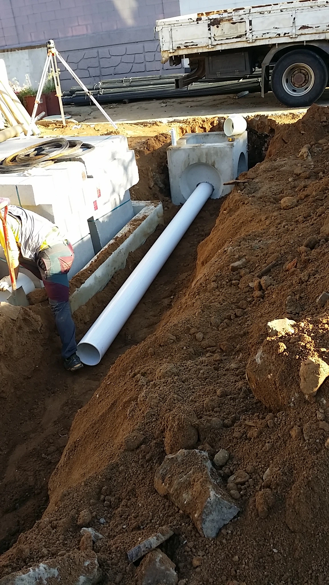 저희 현장은 양옆에 여유공간이 없어 건물의 기초 이전에 정화조와 하수관로를 매립하는 순서가 되었습니다.
