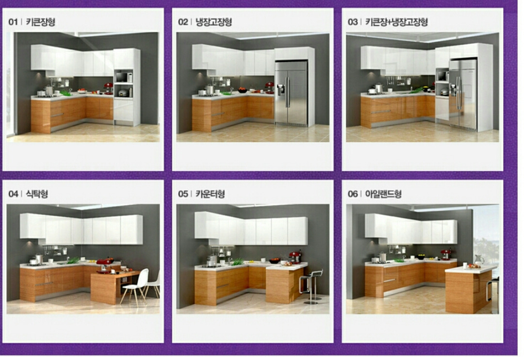 제가 주문한건 아래 4번 타입에 키큰장이 들어간 상품이었는데 문제는 본품과 식탁색깔 그리고 키큰장의 색이 다 다른겁니다. 온라인 상품이라 색 변경이 가능하지않고 아래의 색조합대로만 설치된답니다. 결국 세트상품으로 샀지만 따로 사서 끼워맞춘 느낌을 주게되네요.