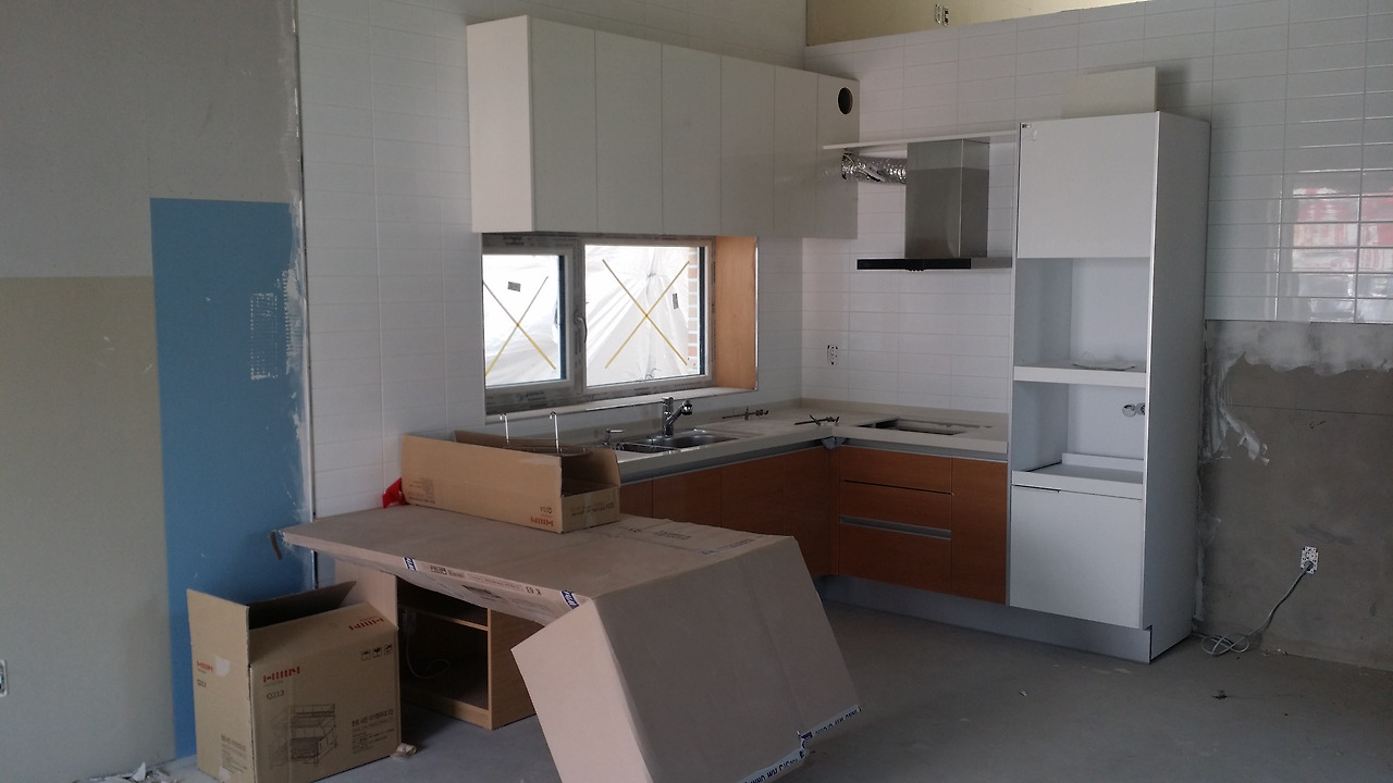 2층은 내부 페인트와 조화를 이뤄야해서 유로 8000으로 했습니다. 3.6미터에 0.7미터 아일랜드 식탁이 포함된 구성입니다. 유로 8000은 단일 색상의 유로 9000보다 색상이 하나 더 선택 가능하고 도장이 약간 고급이랍니다.(큰 차이는 없을듯 하지만요..)