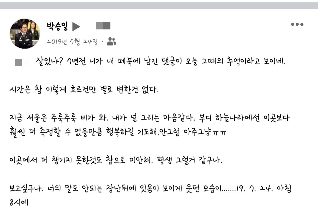 잘 있냐? 7년 전 니가 내 페이스북에 남긴 댓글이 오늘 그때의 추억이라고 보이네. 시간은 참 이렇게 흐르건만 별로 변한 건 없다. 지금 서울은 주룩주룩 비가 와. 내가 널 그리는 마음 같다. 부디 하늘나라에선 이곳보다 훨씬 더 행복하길 기도해. 안 그럼 아주 그냥ㅠㅠ.