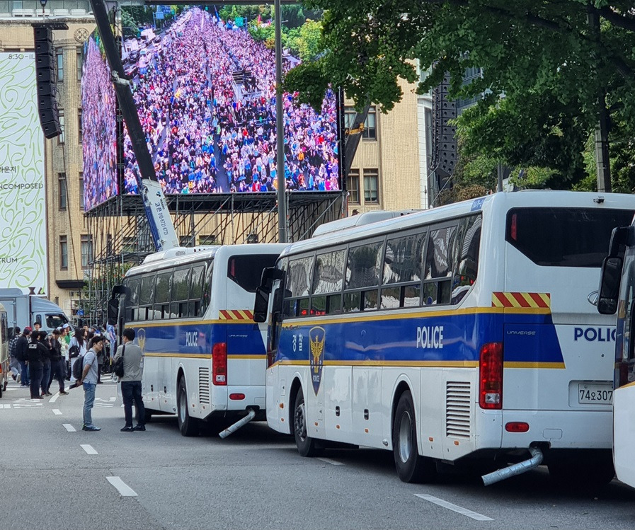가끔은 시위대에서 신고된 행진 코스 차선을 넘어 추가로 행진하려고 하는 때도 있습니다. 사실 요즘은 거의 없어졌습니다. 법에 정해진 코스대로 행진합니다. 무리하게 차도를 점거하고 교통을 방해했던 시위는 이제 완전히 사라진 듯합니다.