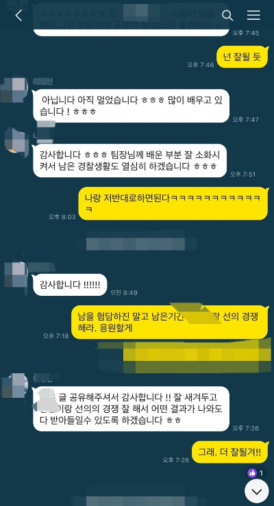 “글 공유해 주셔서 감사합니다. 잘 새겨두고 ○○이랑 선의의 경쟁 잘해서 어떤 결과가 나와도 다 받아들일 수 있게 하겠습니다”
