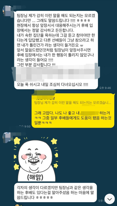 앞서 말씀드렸던 것처럼 팀장님이 앞장서 주시면 후배 처지에서는 내가 한 행동이 틀리지 않았다는 생각이 들어요. 그런 부분 감사합니다.”
