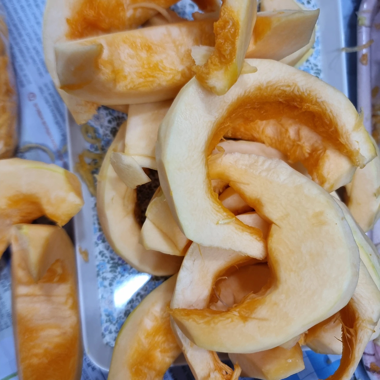 늙은 호박을 깨끗이 씻어 조각조각 내어 긁으시기 편하게 해 드렸다.