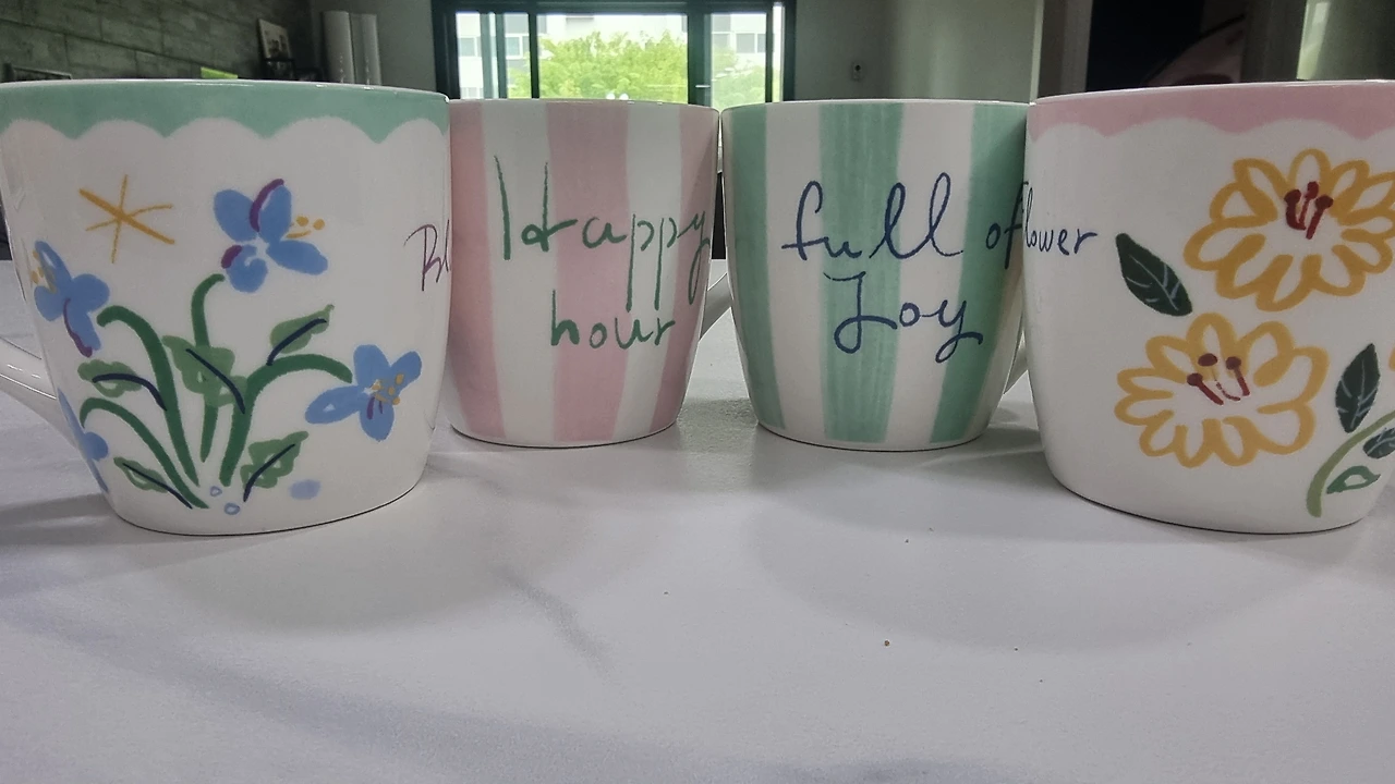 근데 이번에는 귀여운 컵에 눈에 들어왔다. 귀여운 꽃들이 잘 그린 듯 못 그린 듯 순박하고 예뻤다. 컵을 들어보니 가벼워 마음에 들었다.
