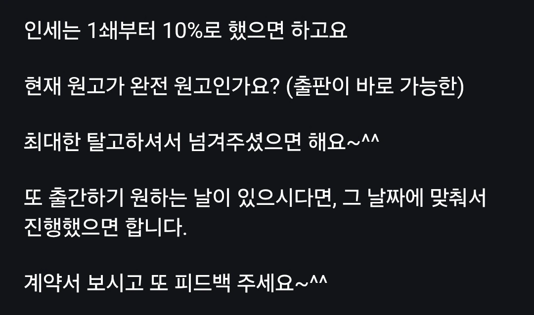이런 연락을 받고 미팅을 진행해봤구요. (인생 첫 미팅이었는데 잘 된 케이스라 행복합니다.) 미팅 후 가계약서를 받고, 계약까지 완료했습니다. 아마 이 도서는 내년쯤 나올 듯해요!