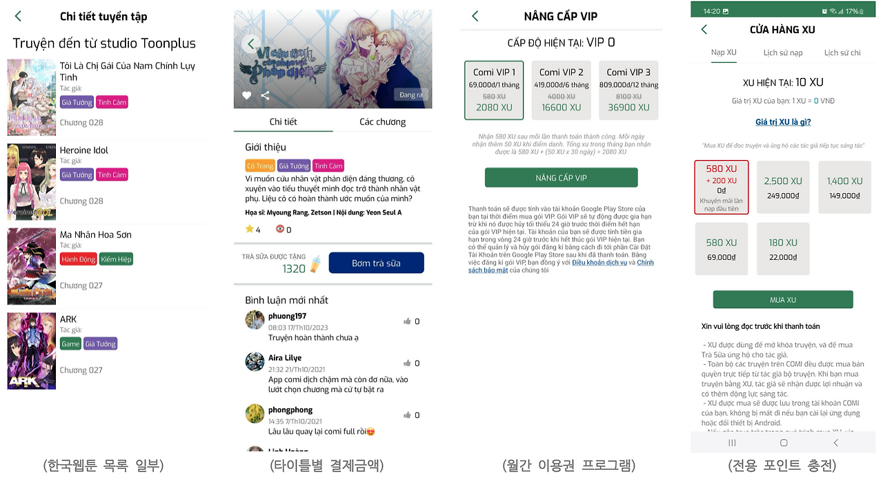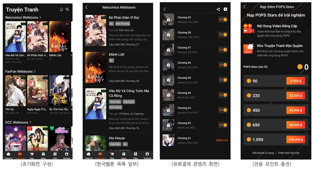 한국과 유사하게 1화~10화까지는 무료로 오픈을 하고 11화부터 유료결재를 하는 방식을 사용하고 있습니다. 1회차 비용은 30코인으로 약 3,000 VND입니다. (한화 약 160원) 수수료 비율과 R/S의 비율은 절확하게 확인할 수는 없지만 콘텐츠 수출을 위한 미팅을 진행하게 된다면 세부 조건들에 대한 내용들을 확인하실 수 있을 것으로 생각합니다.