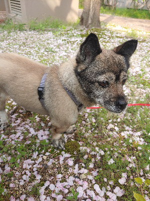 벚꽃이 폈다가 다 떨어지고 이제 파릇파릇한 싹이 트고 있어. 벚꽃과 잘 어울리던 강아지.